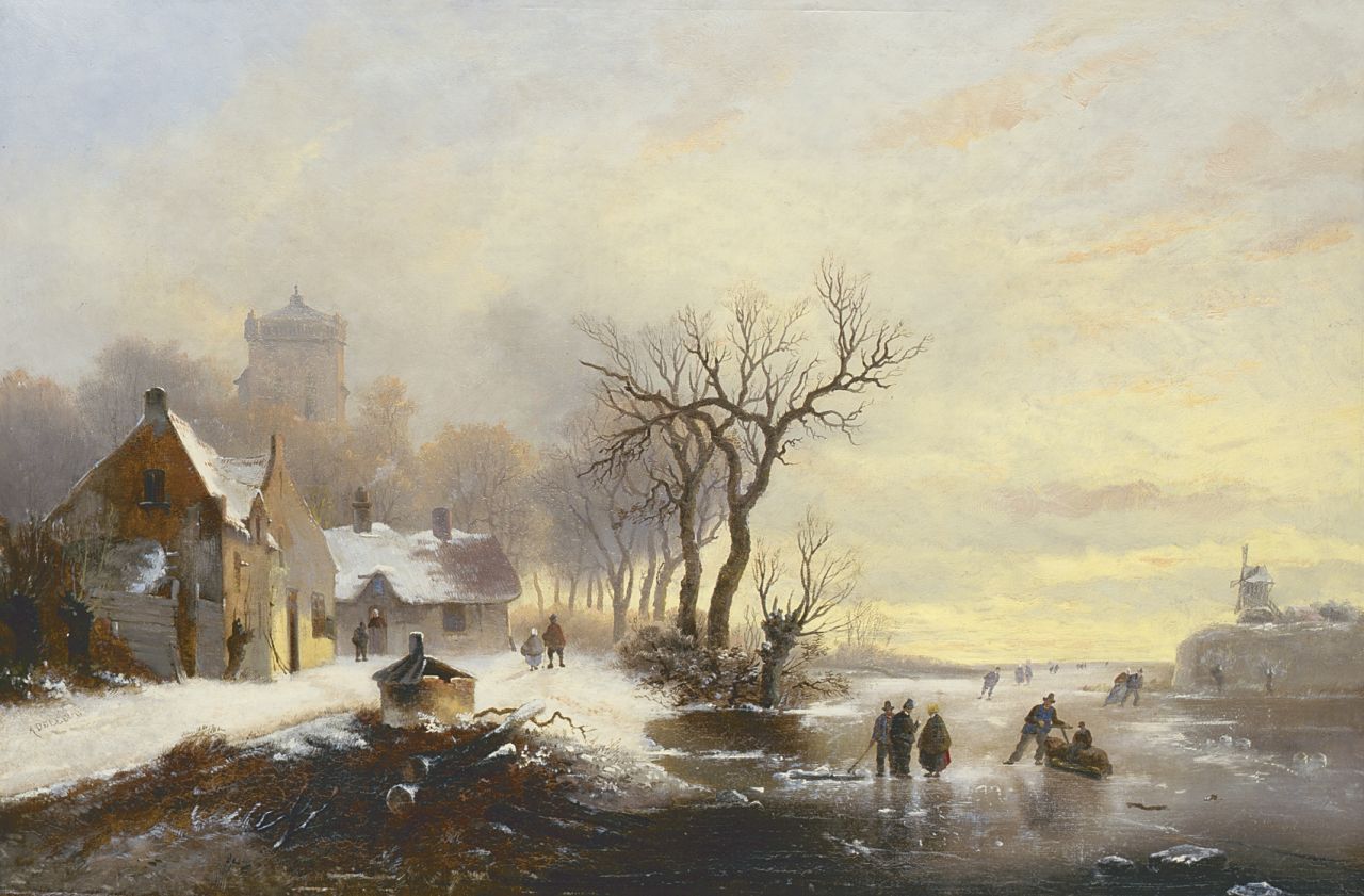 Alexis de Leeuw kunstwerk • schilderij • voorheen te koop Schaatsers langs de dorpsrand
