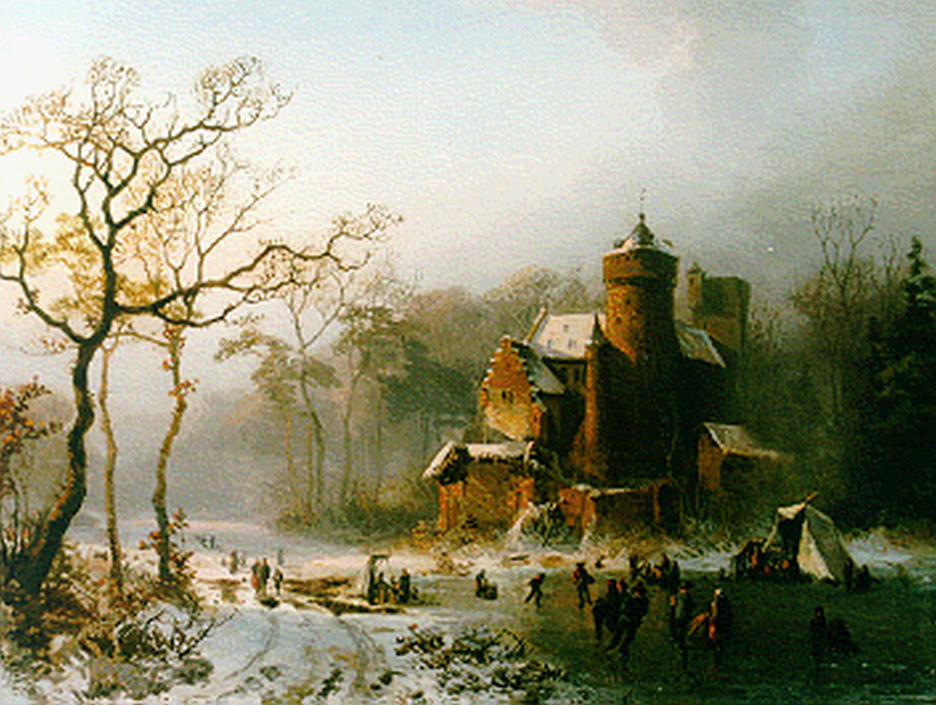 Alfred Edouard Agenor van Bylandt kunstwerk • schilderij • voorheen te koop Schaatsers op een meer bij een kasteel