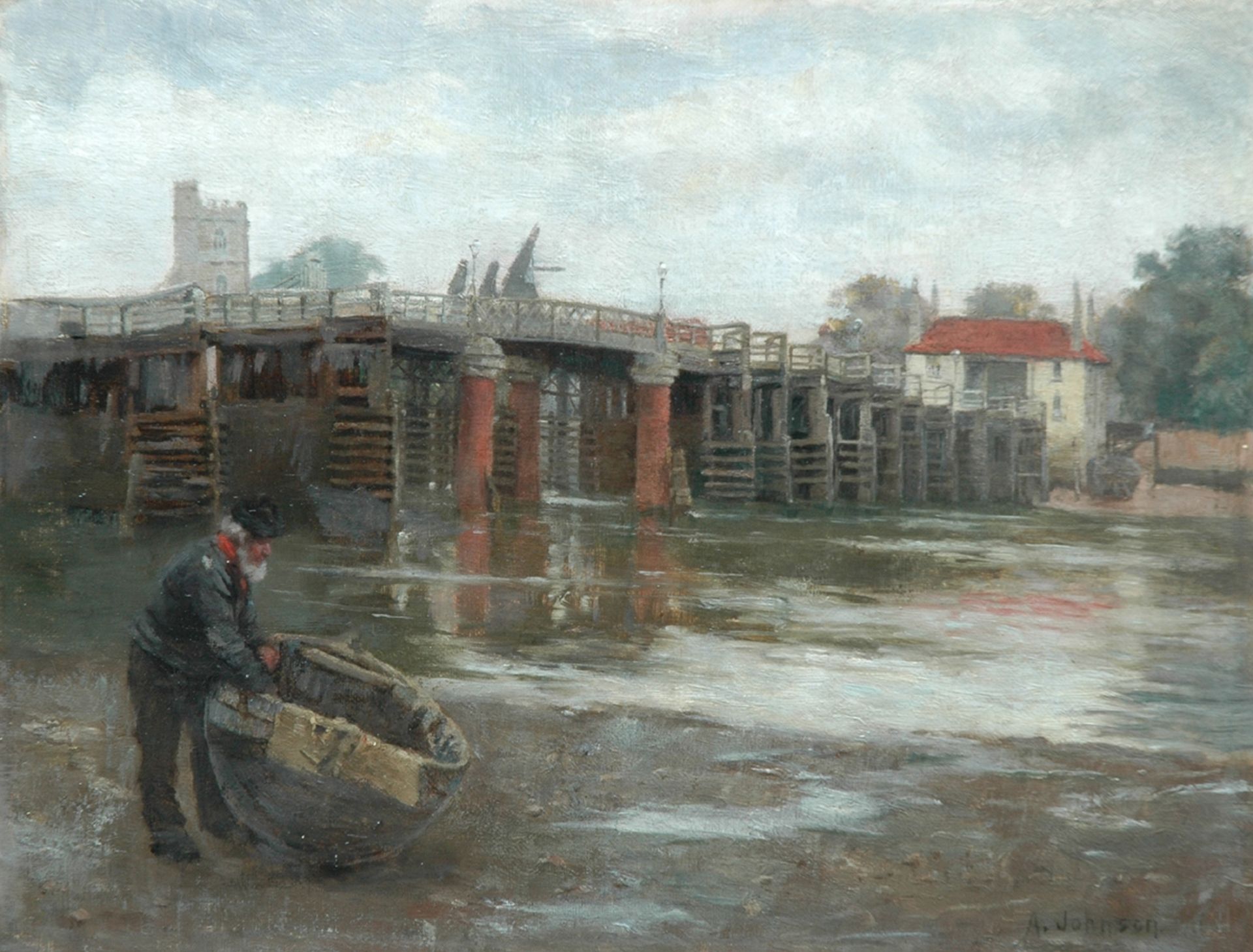 Alfred Johnson kunstwerk • schilderij • voorheen te koop De oude brug, Putney