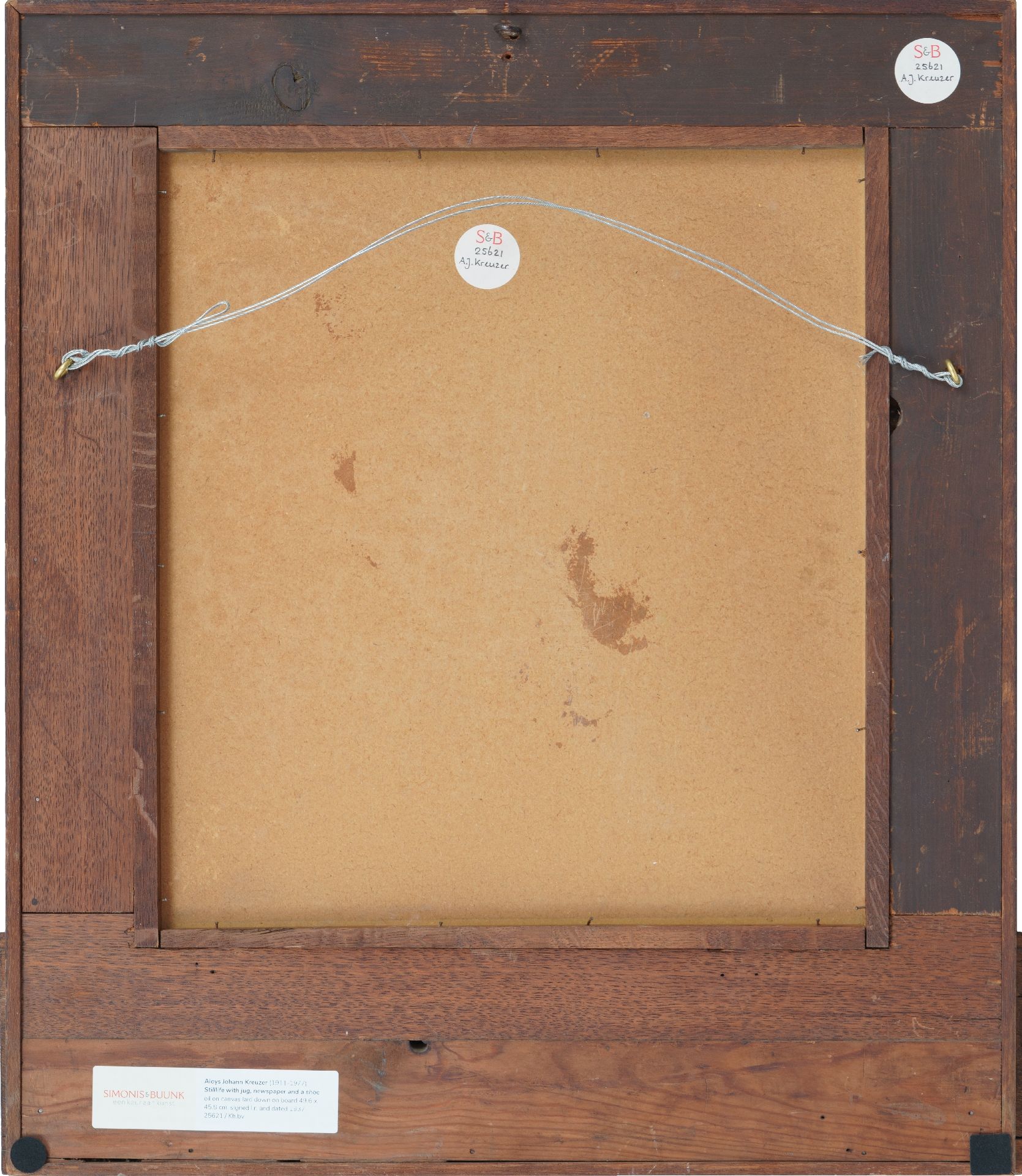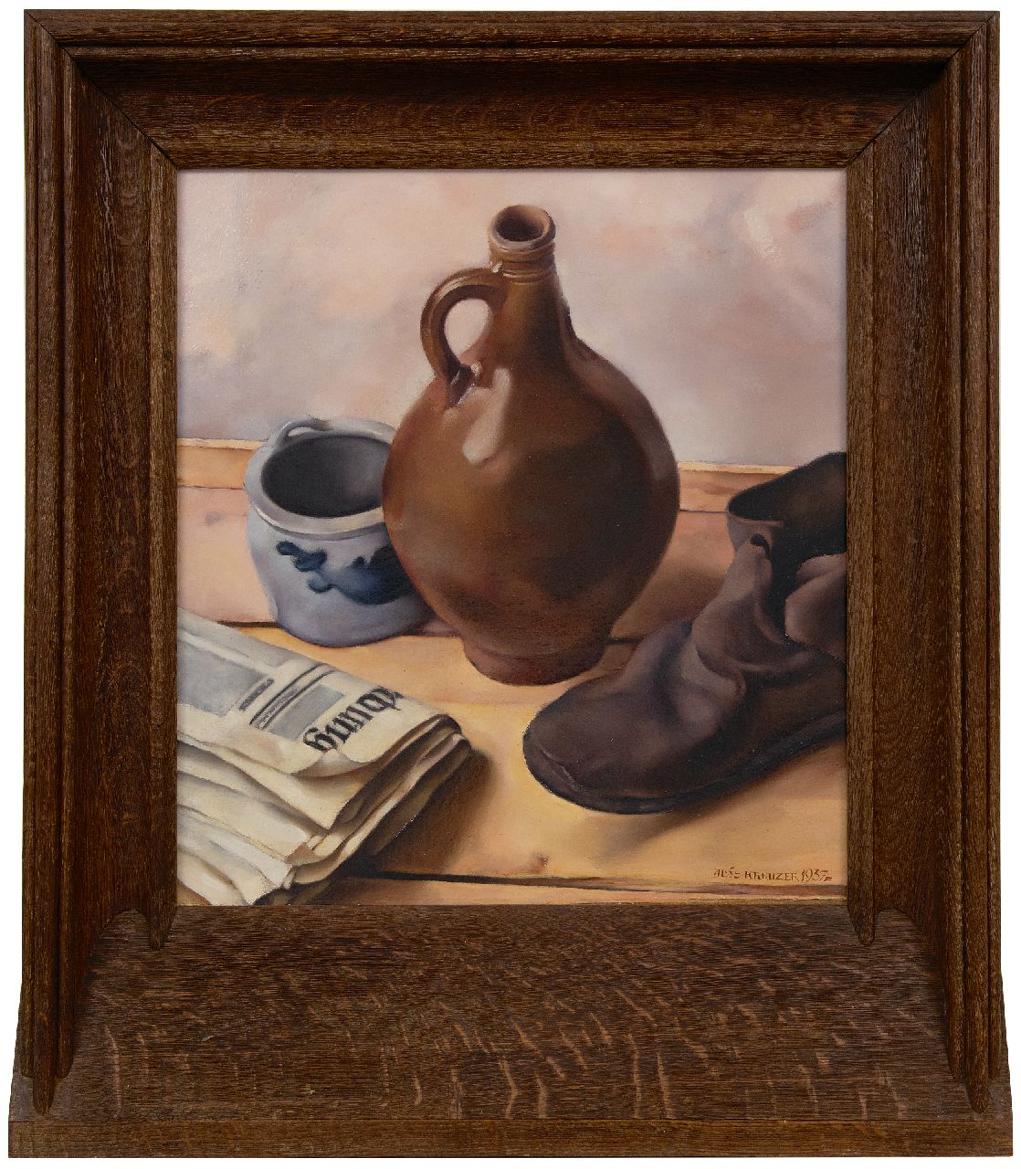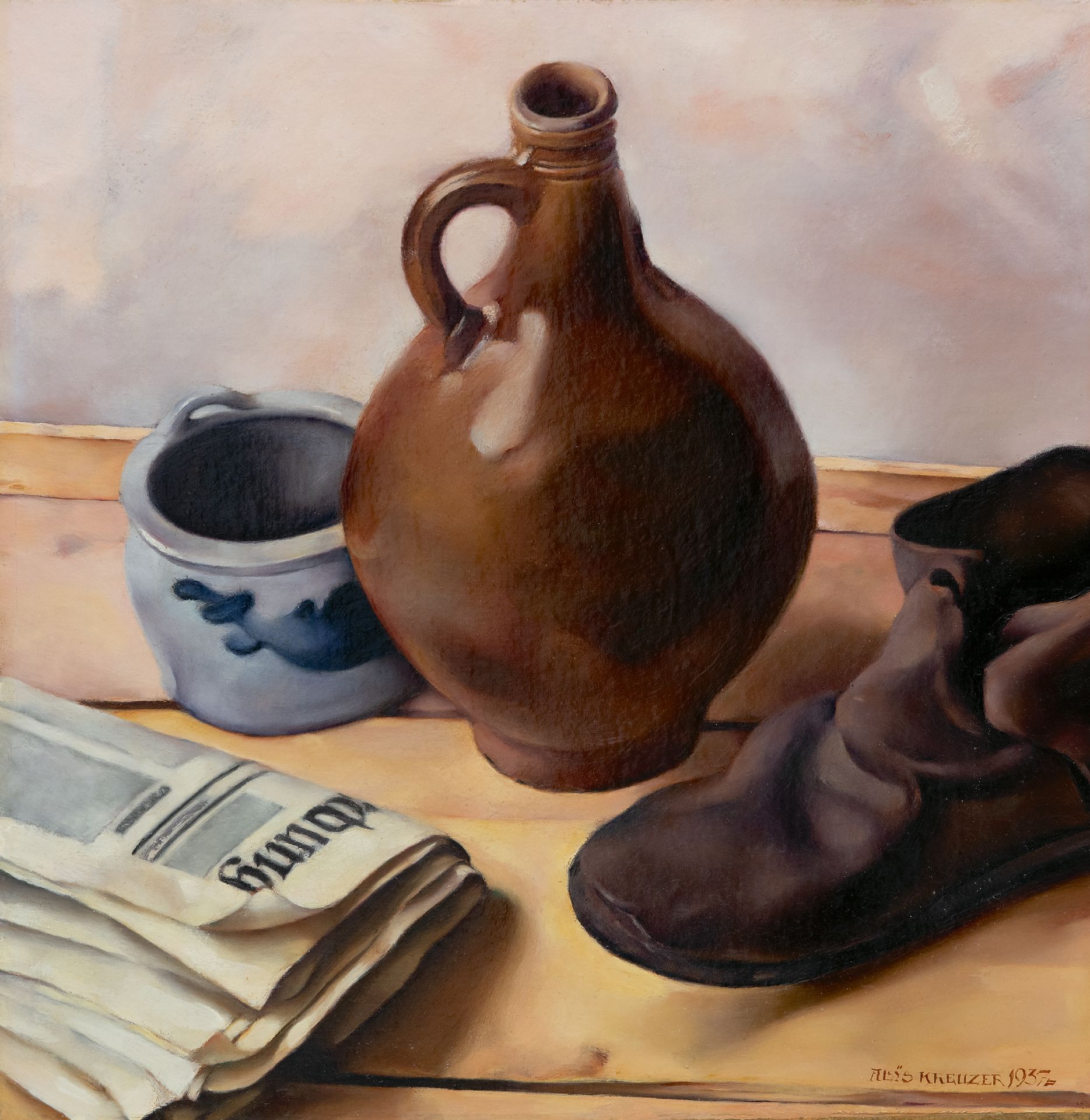 Aloys Johann Kreuzer kunstwerk • schilderij • te koop Stilleven met kruik, krant en een schoen
