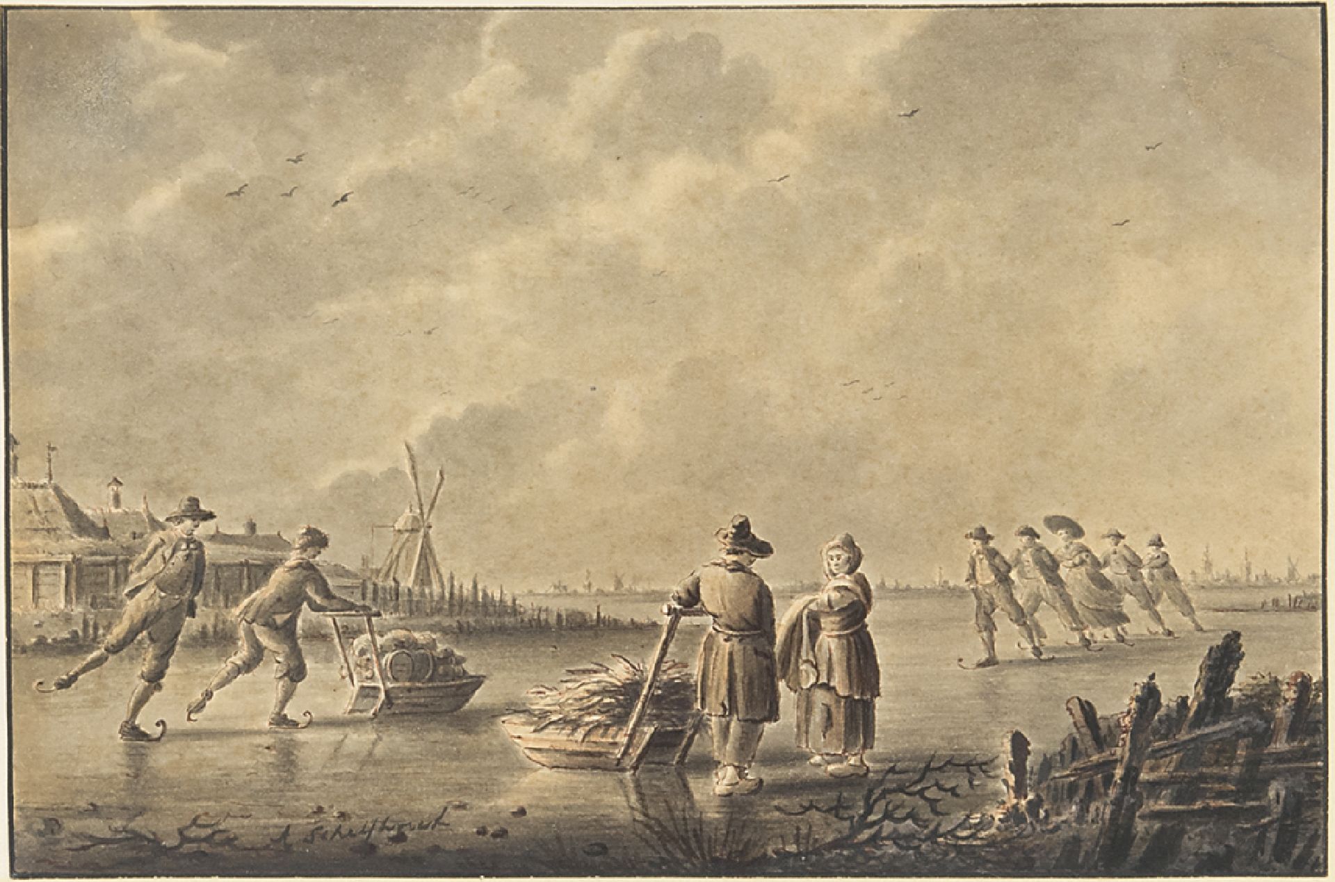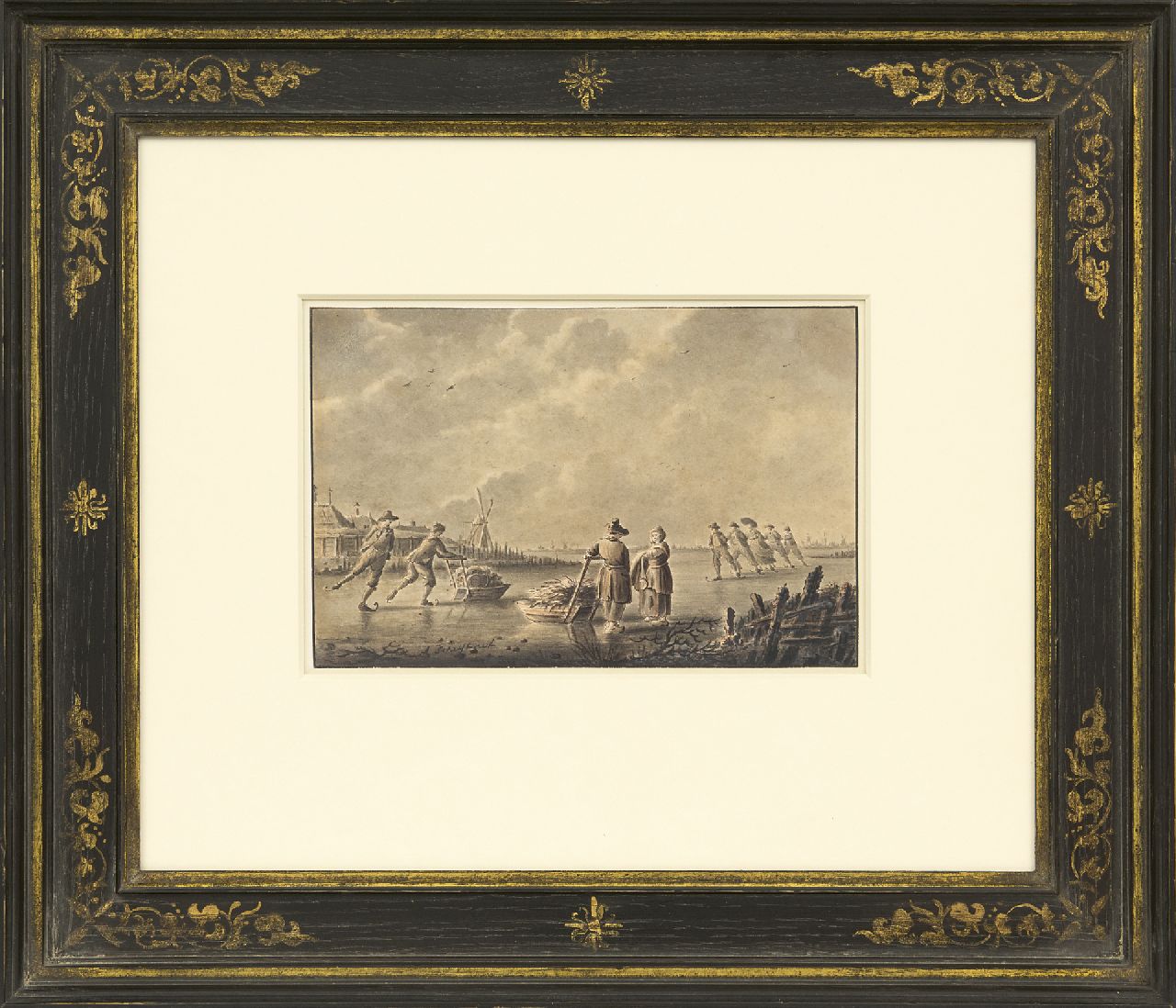 Andreas Schelfhout kunstwerk • aquarel • tekening • voorheen te koop Bevroren vaart met schaatsers en duwsleden