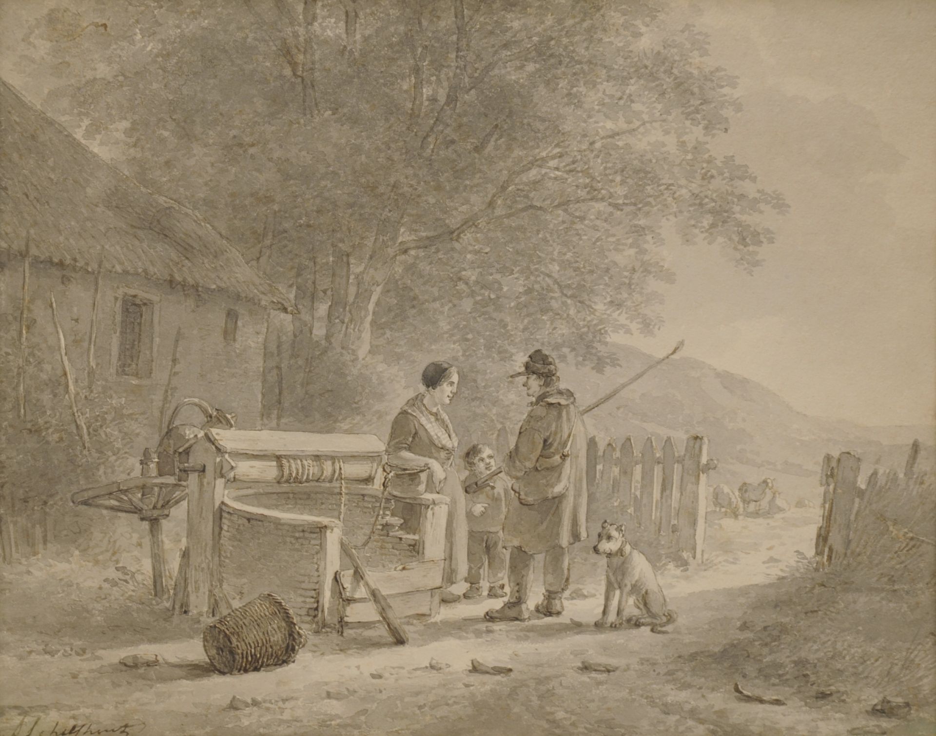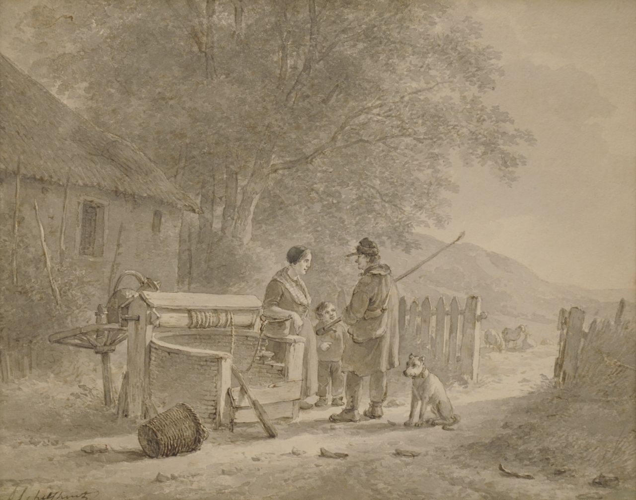 Andreas Schelfhout kunstwerk • aquarel • tekening • voorheen te koop Figuren in gesprek bij een waterput