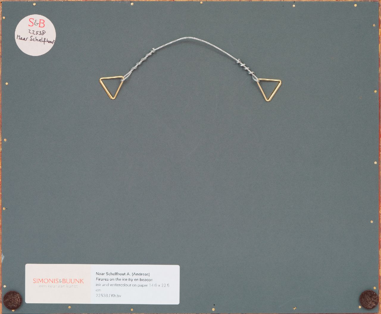 Andreas Schelfhout kunstwerk • aquarel • tekening • te koop Figuren op het ijs bij een vuurbaken I.O. I.O.