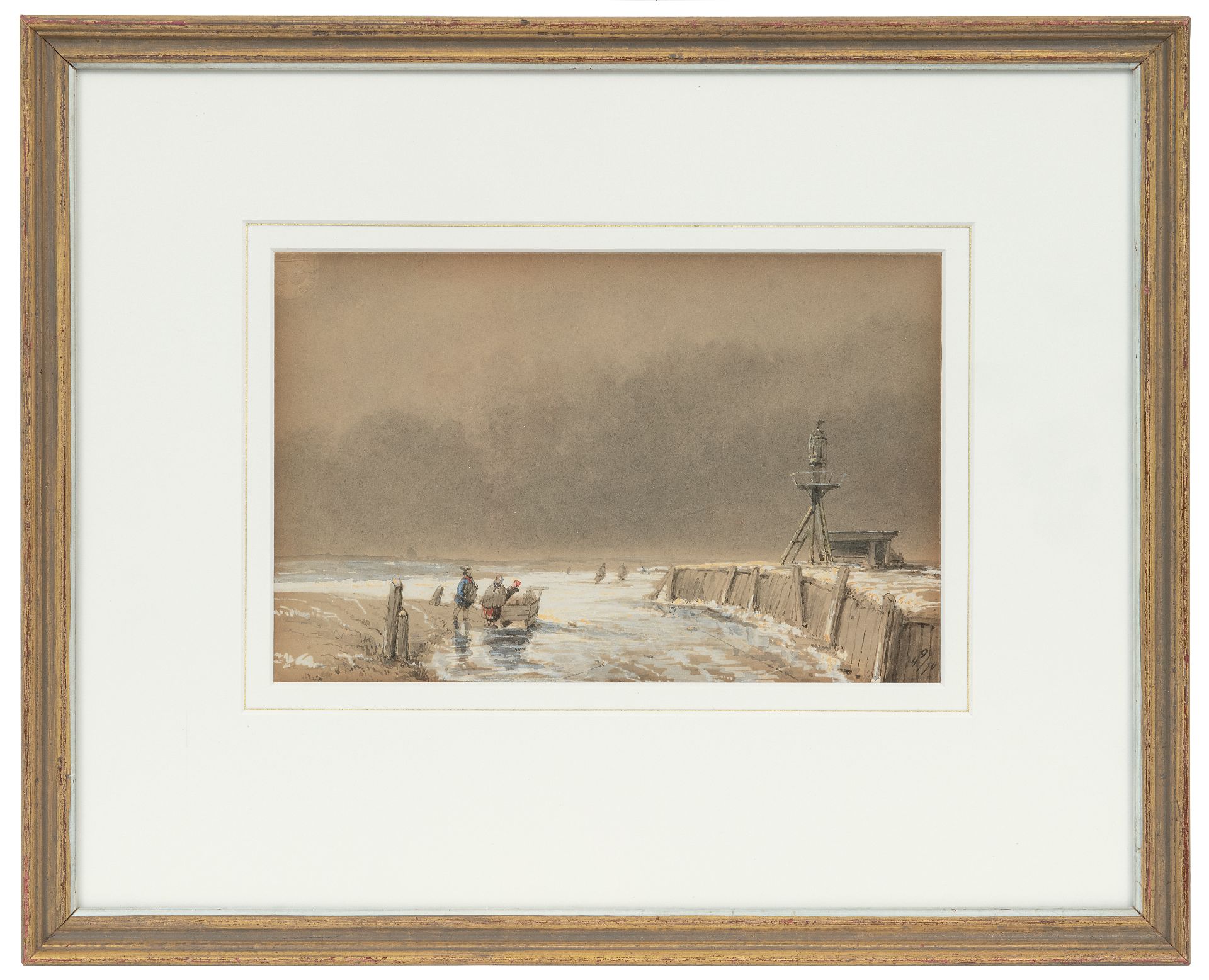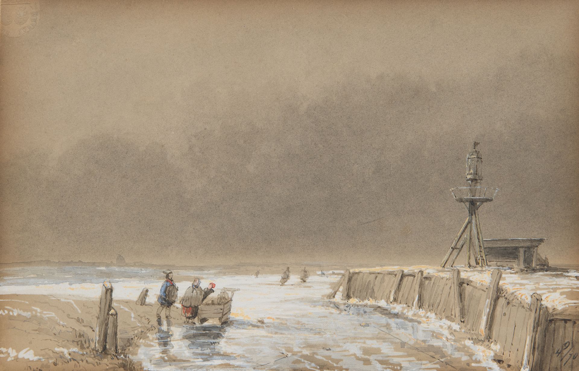 Andreas Schelfhout kunstwerk • aquarel • tekening • te koop Figuren op het ijs bij een vuurbaken I.O. I.O.