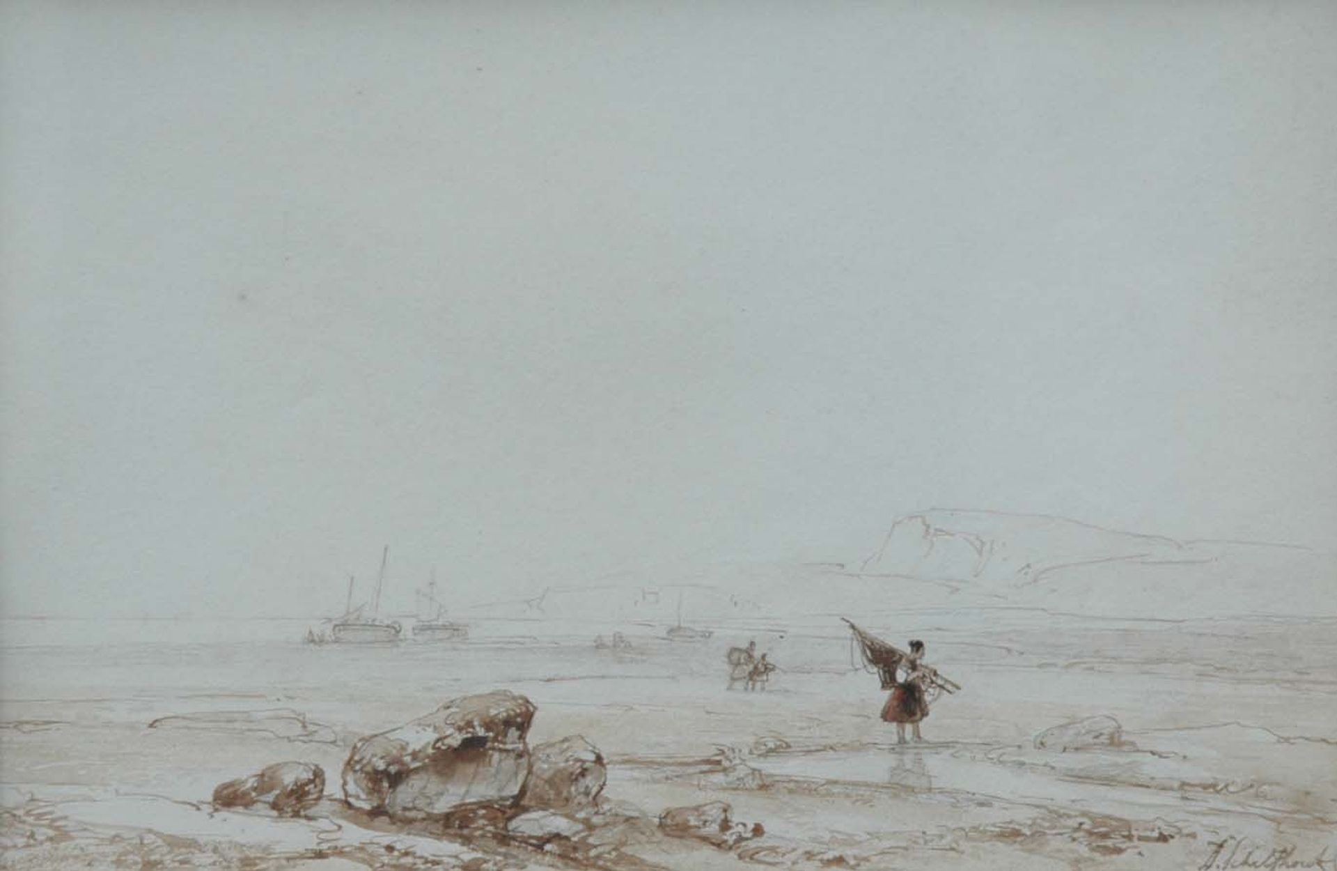 Andreas Schelfhout kunstwerk • aquarel • tekening • voorheen te koop Laag tij aan de Noord-Franse kust