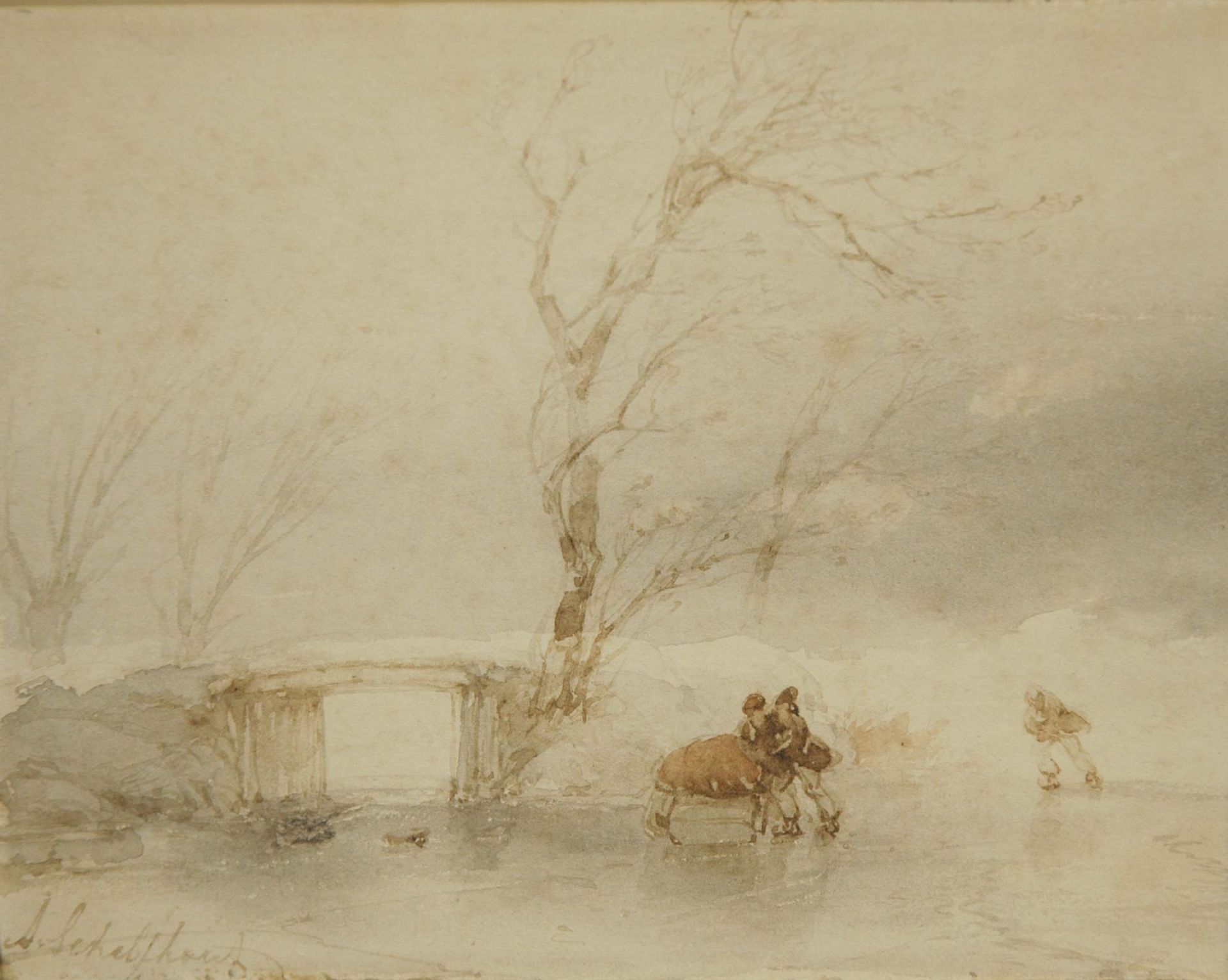 Andreas Schelfhout kunstwerk • aquarel • tekening • voorheen te koop Met de duwslede onder het bruggetje door