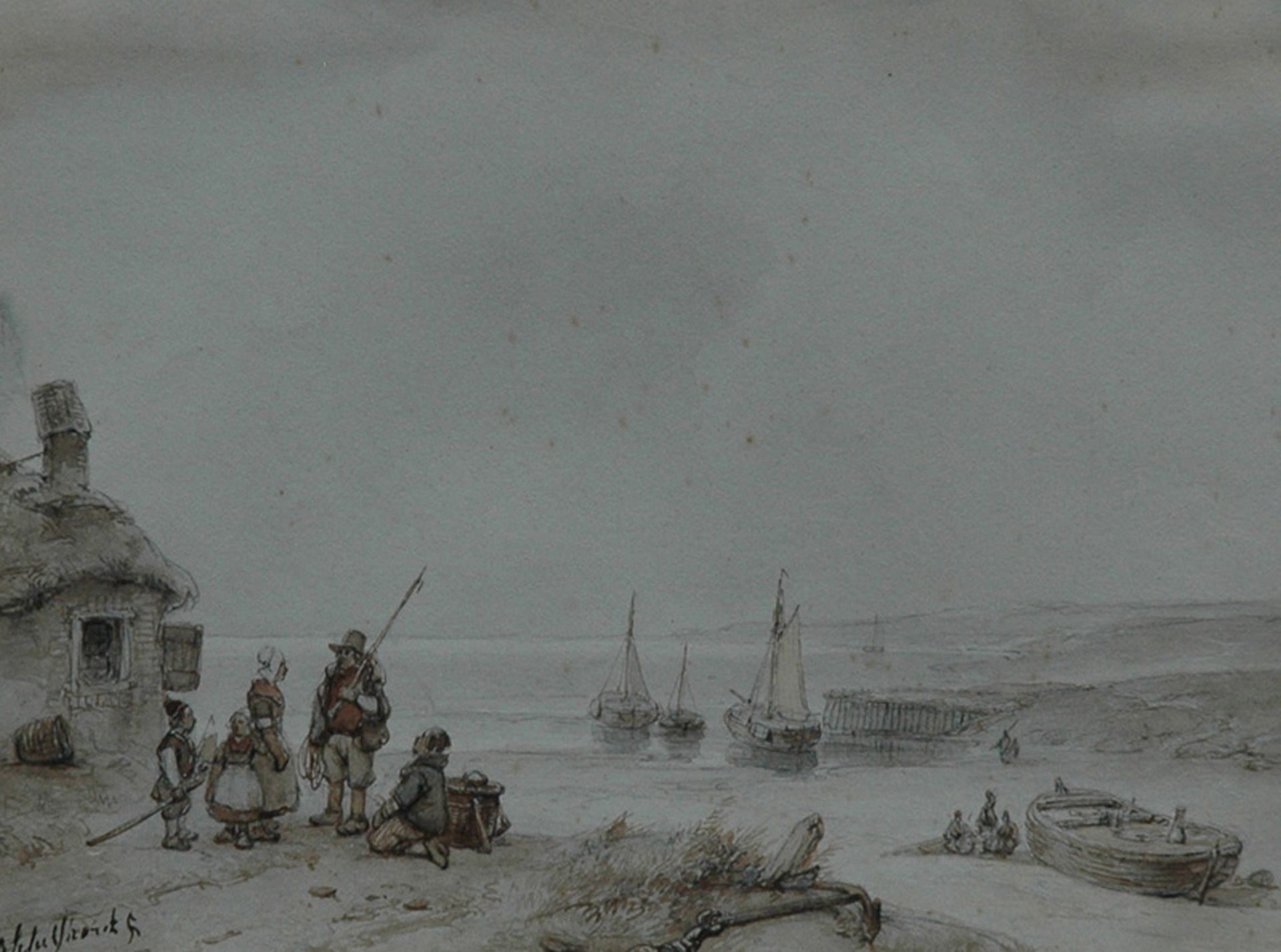 Andreas Schelfhout kunstwerk • aquarel • tekening • voorheen te koop Vissersfamilie bij het strand, Frankrijk