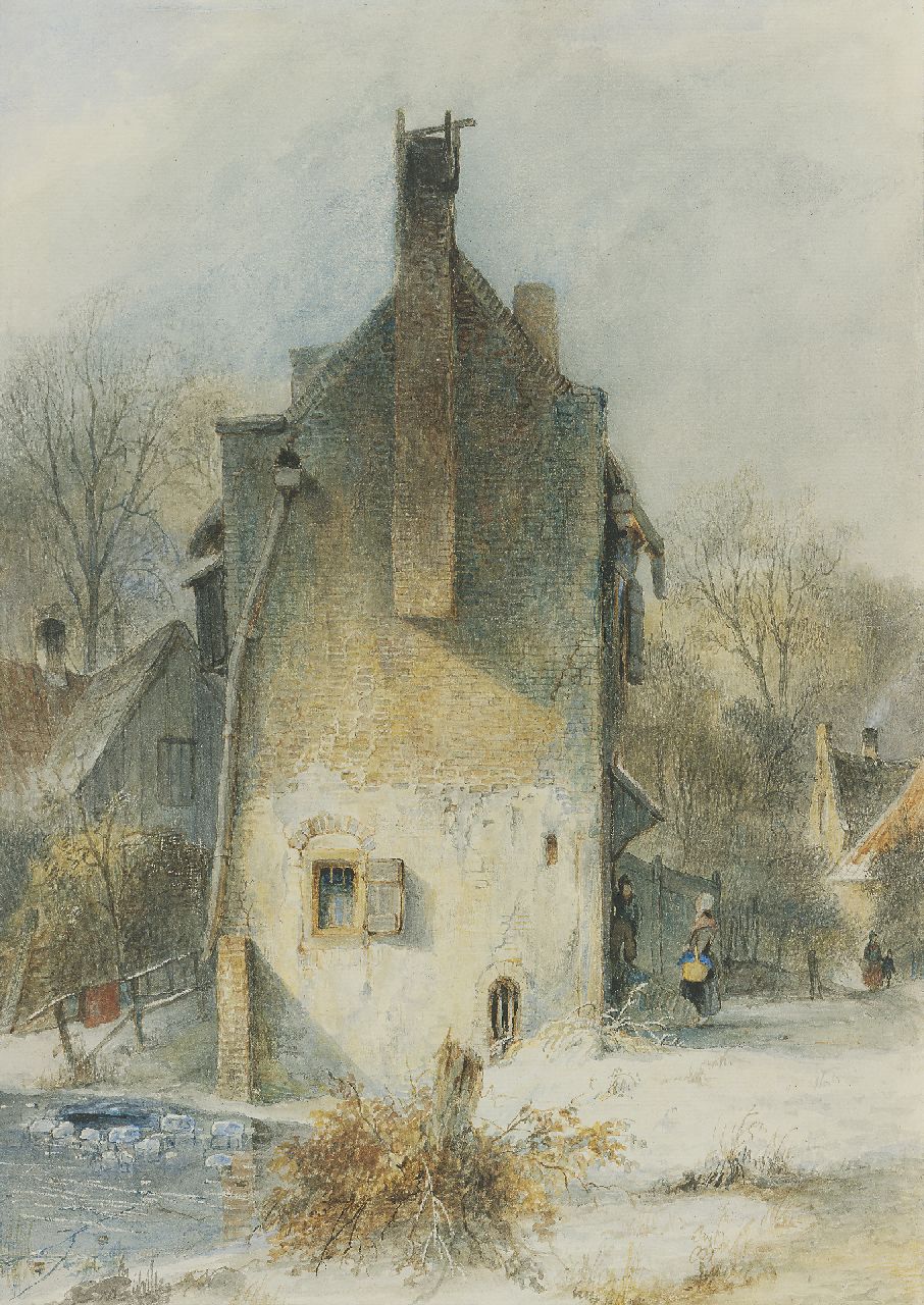 Andreas Schelfhout kunstwerk • aquarel • tekening • voorheen te koop Winters dorpsgezicht