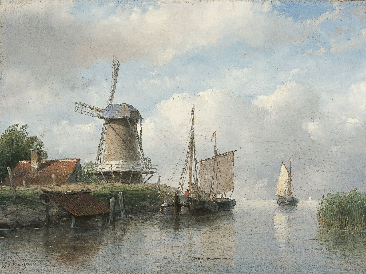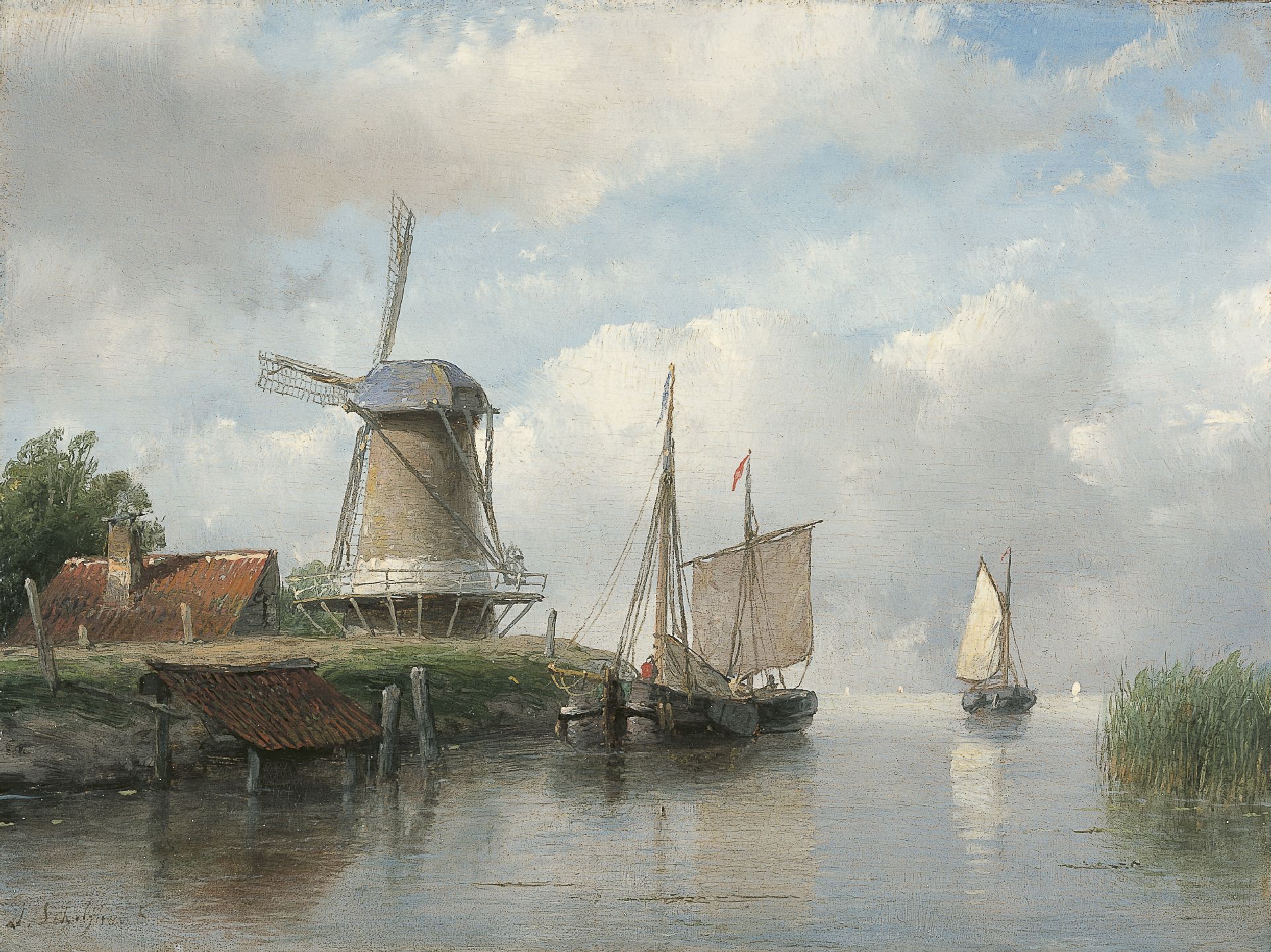 Andreas Schelfhout kunstwerk • schilderij • voorheen te koop Afgemeerde zeilschepen bij een molen