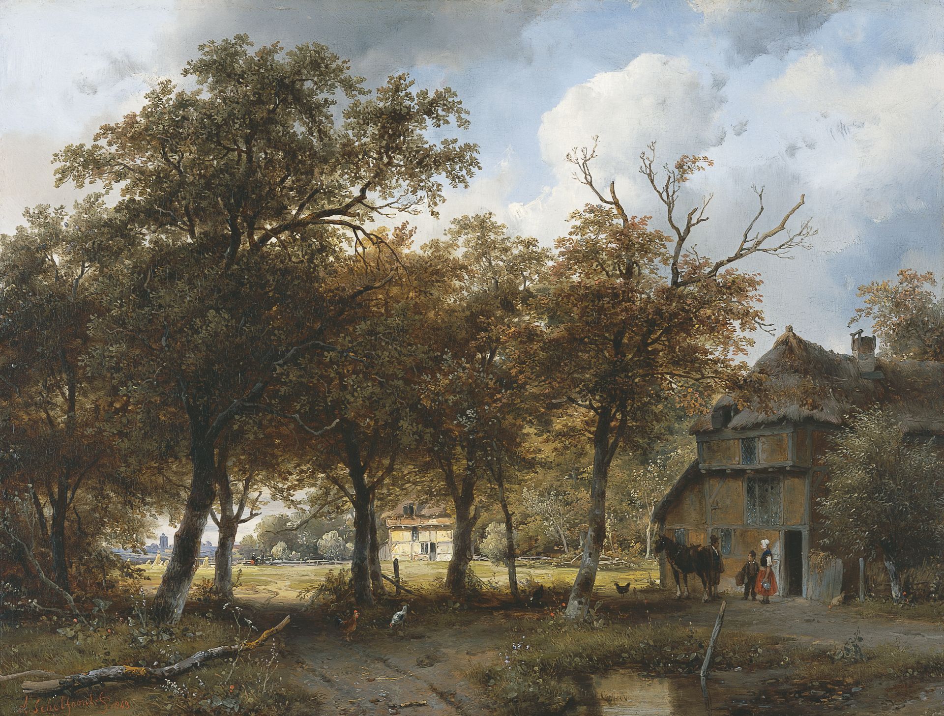 Andreas Schelfhout kunstwerk • schilderij • voorheen te koop Boslandschap met boerenhuizen en een stad aan de horizon