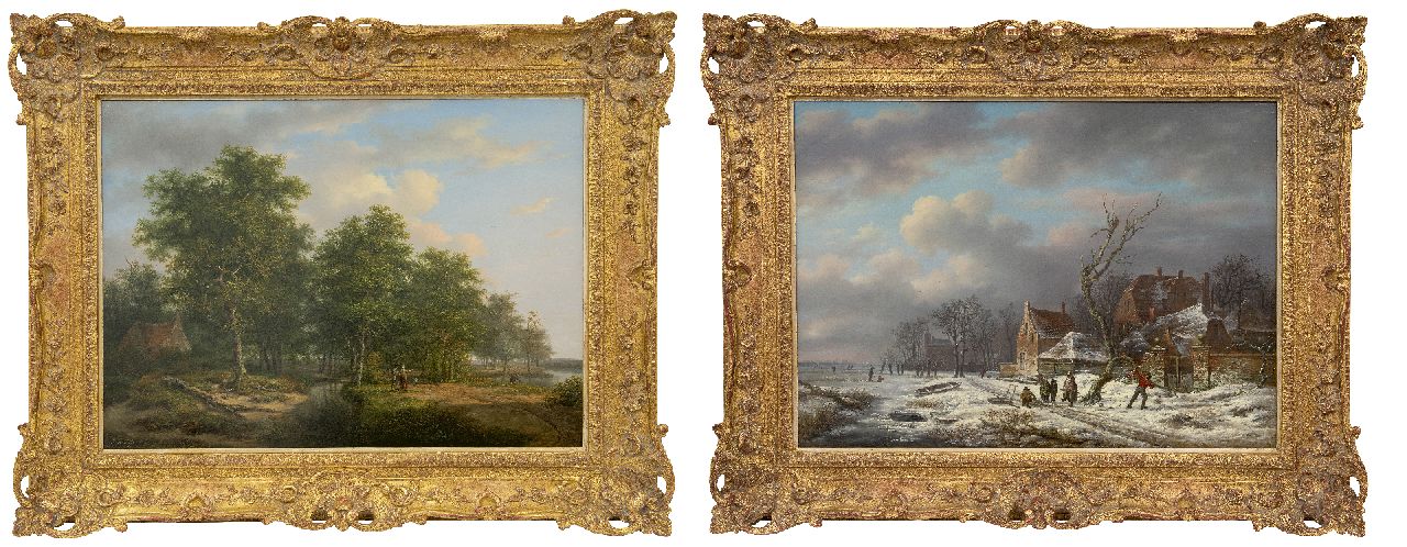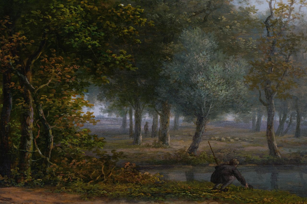 Andreas Schelfhout kunstwerk • schilderij • voorheen te koop Boslandschap met figuren bij een riviertje (pendant van winterlandschap)