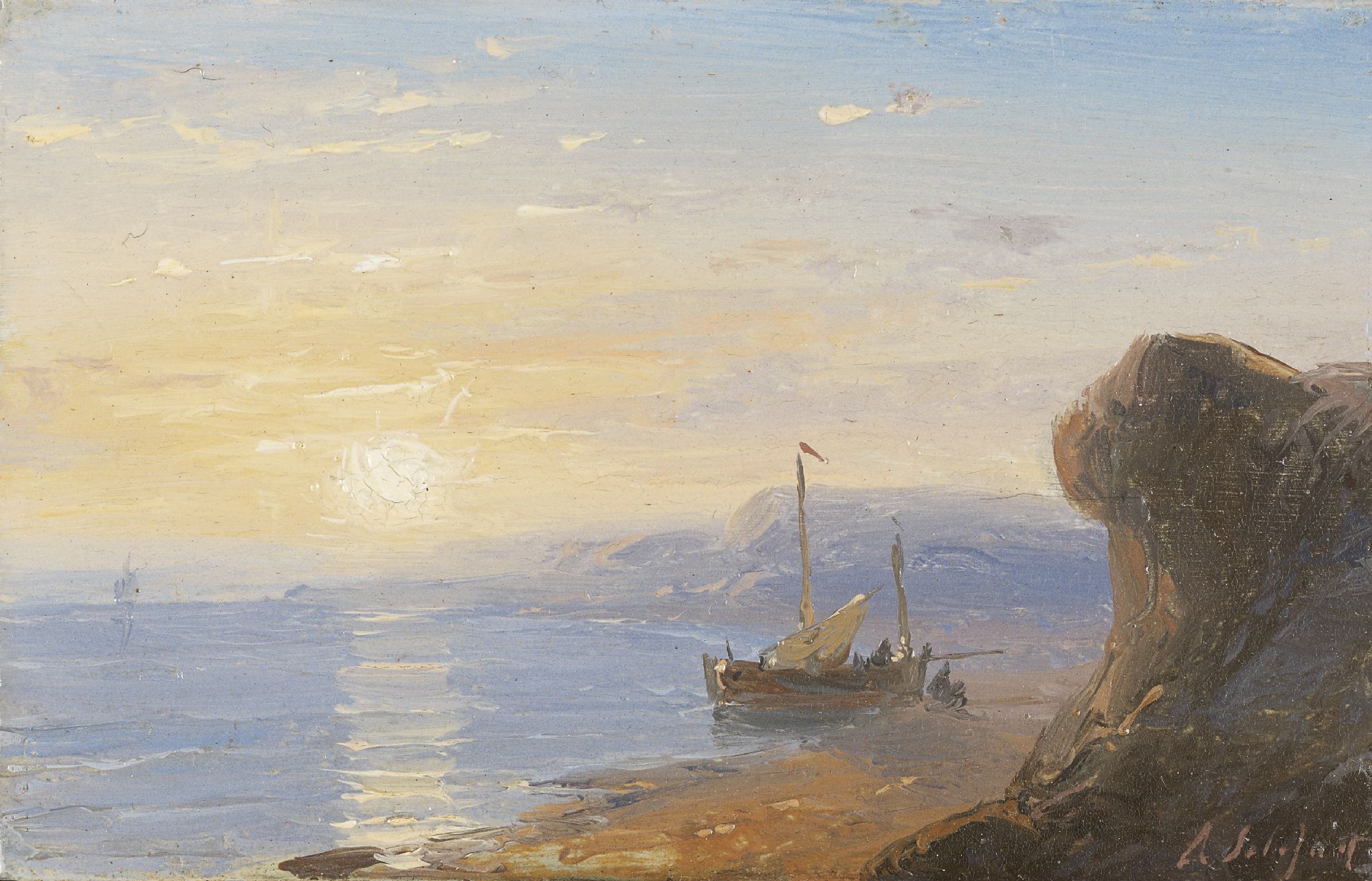 Andreas Schelfhout kunstwerk • schilderij • voorheen te koop De Normandische kust bij ondergaande zon
