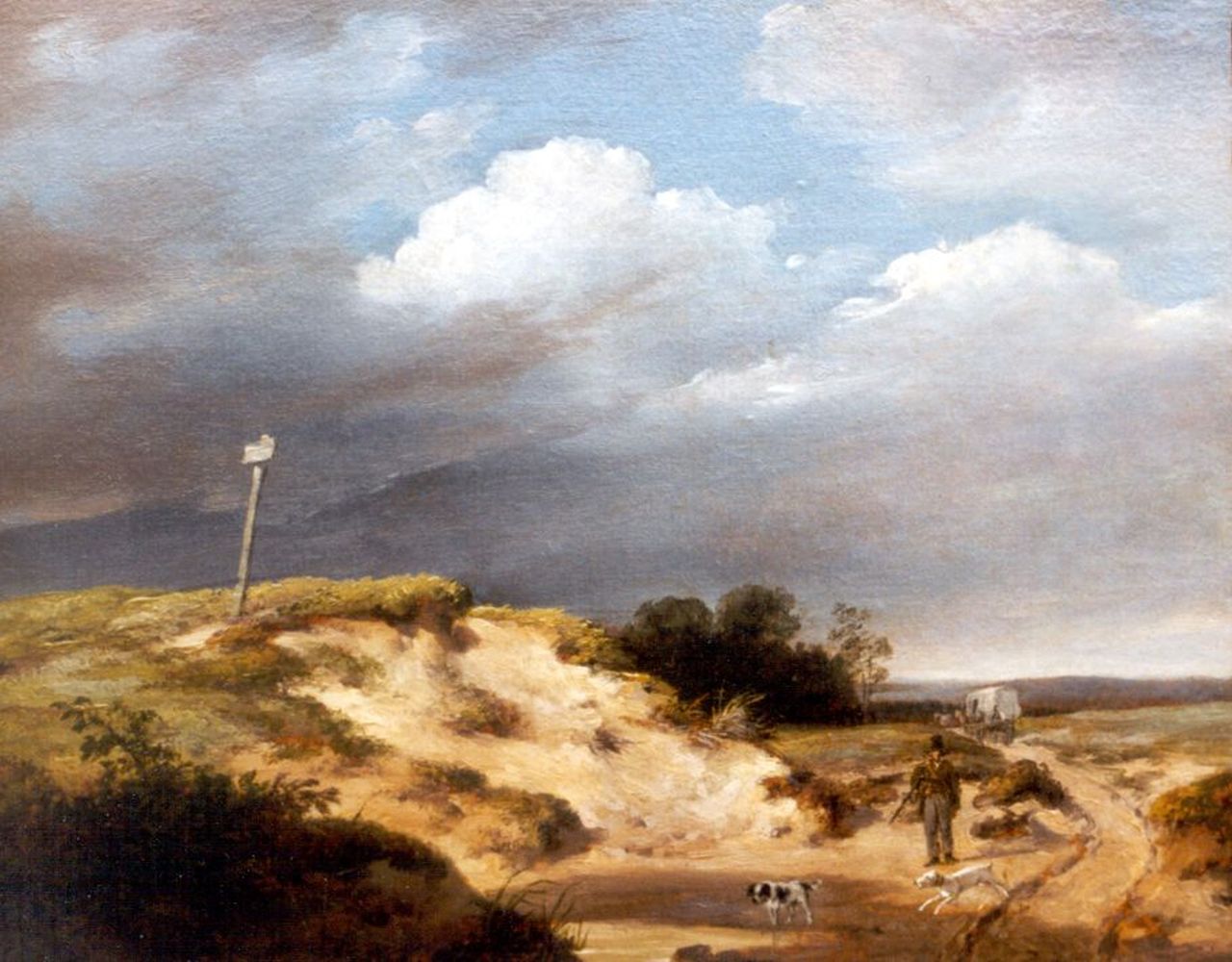 Andreas Schelfhout kunstwerk • schilderij • voorheen te koop Duinlandschap met jager en zijn honden