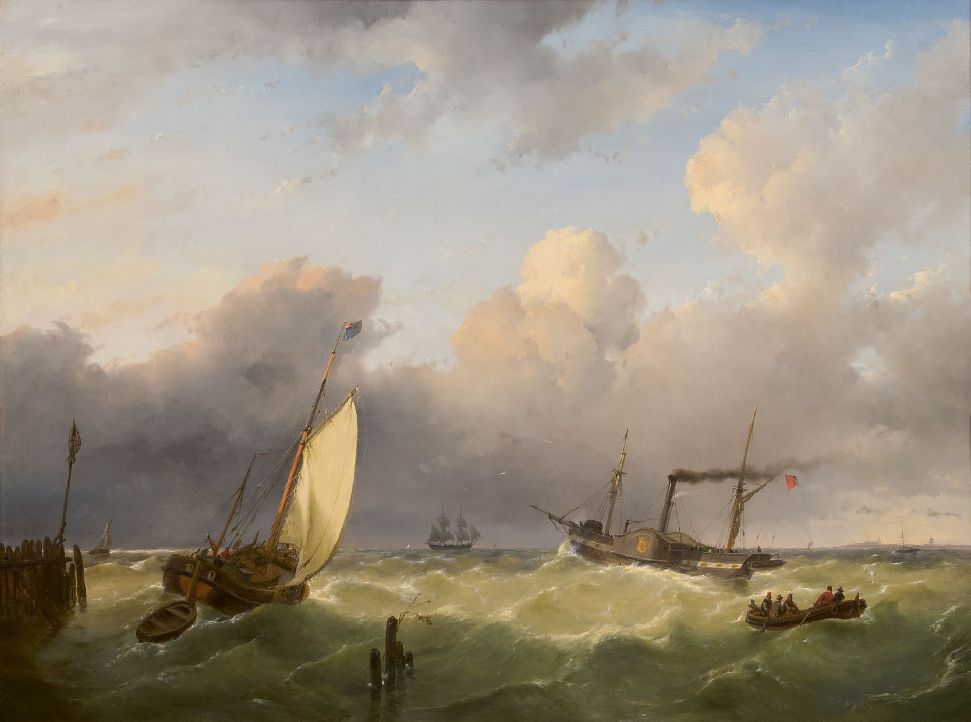 Een fel zonlicht leidt ons oog naar de schuimkoppen op de golven tussen de schepen. Zo verbindt hij oud en nieuw: het zeilschip en het stoomraderschip. Schelfhout legde graag de noviteiten van zijn tijd vast.