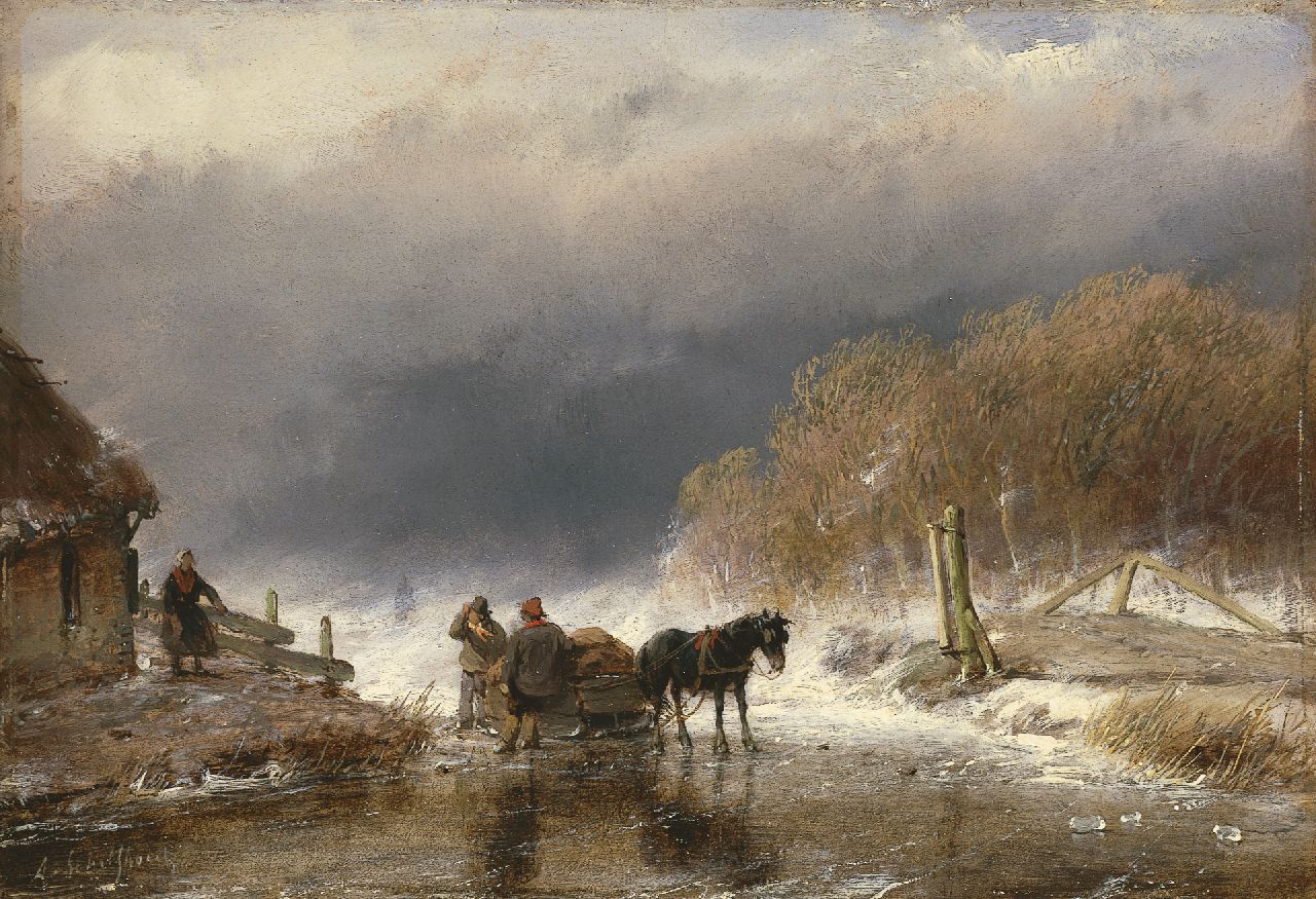 Andreas Schelfhout kunstwerk • schilderij • voorheen te koop Figuren en paard op het ijs