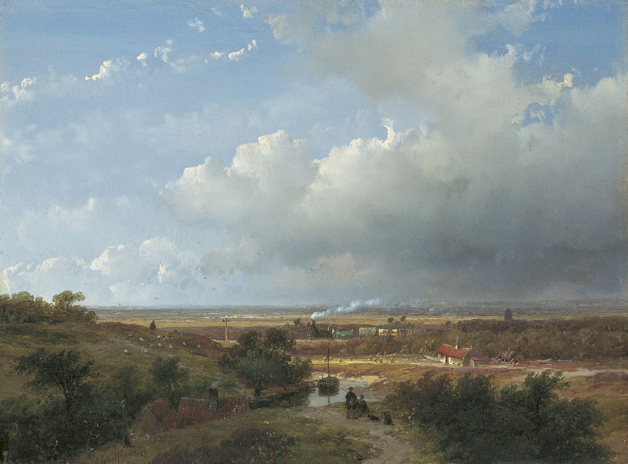 Andreas Schelfhout kunstwerk • schilderij • voorheen te koop Hollands eerste stoomtrein van Haarlem naar Leiden