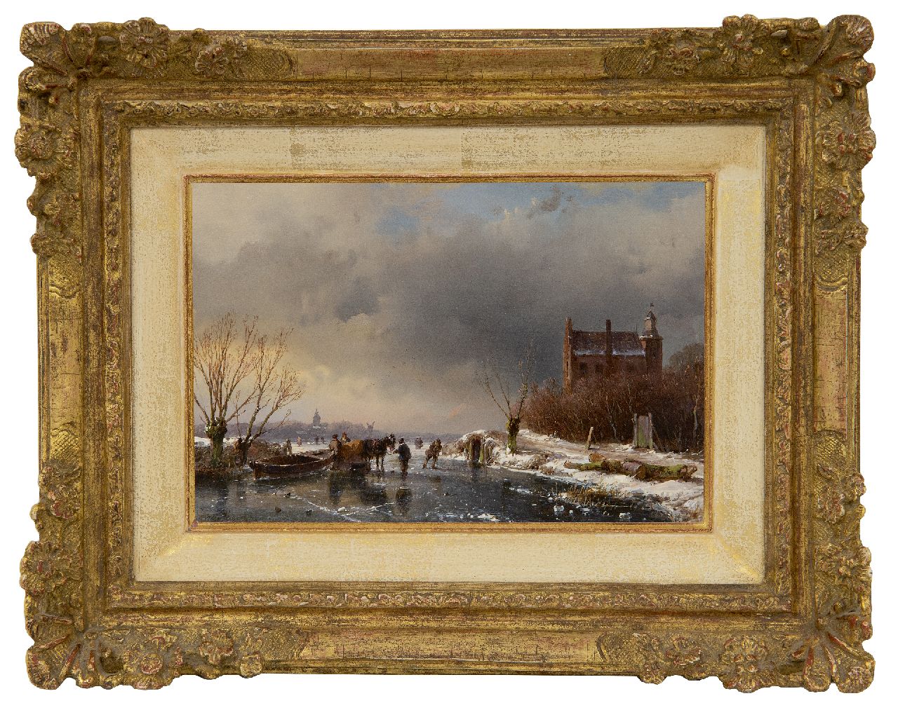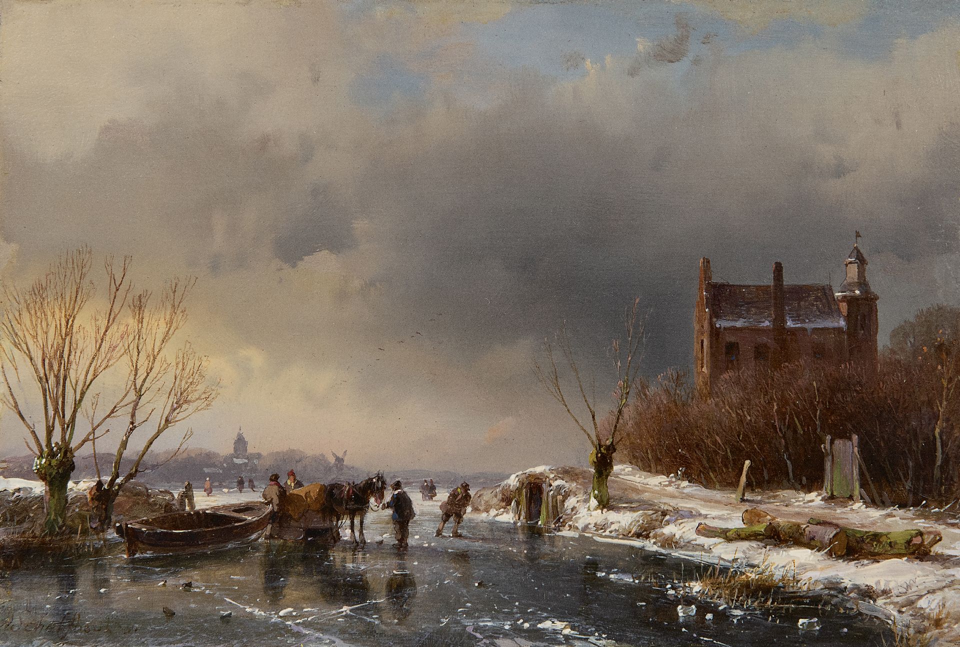 Andreas Schelfhout kunstwerk • schilderij • voorheen te koop IJsgezicht met schaatsers bij een kasteel