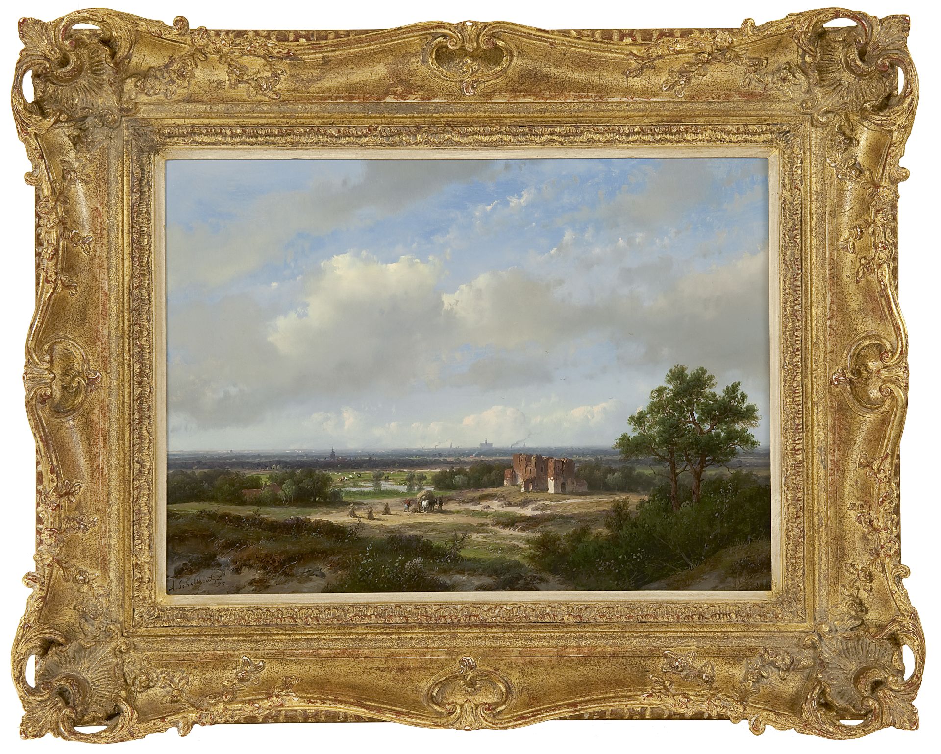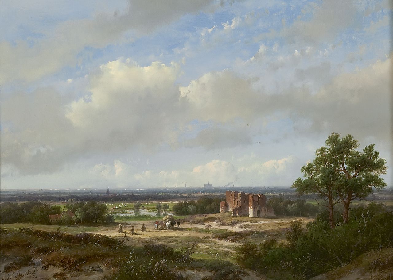 Andreas Schelfhout kunstwerk • schilderij • voorheen te koop Panoramisch landschap met het stadssilhouet van Haarlem en de ruïne van Brederode