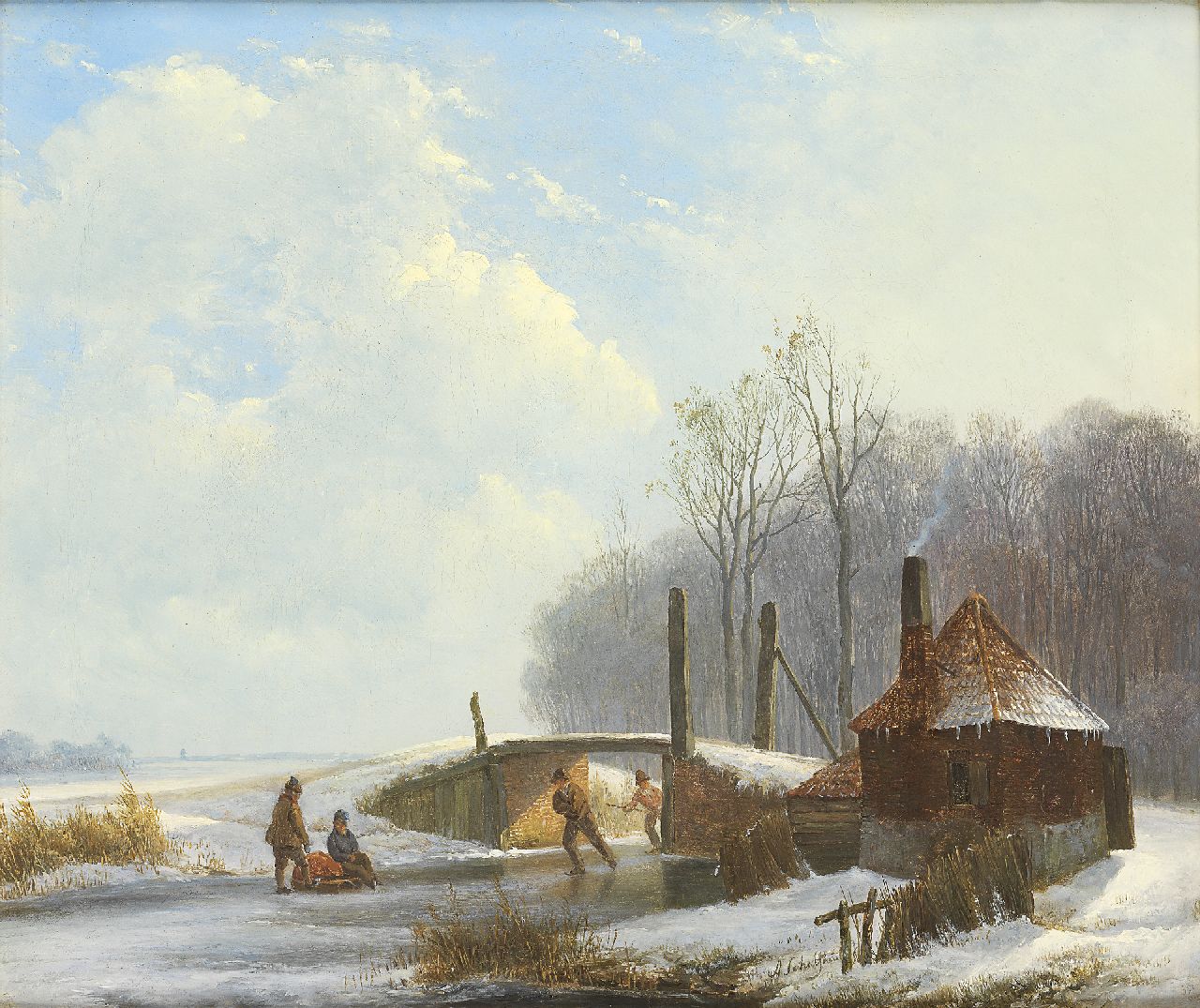 Andreas Schelfhout kunstwerk • schilderij • voorheen te koop Schaatsers bij een brug