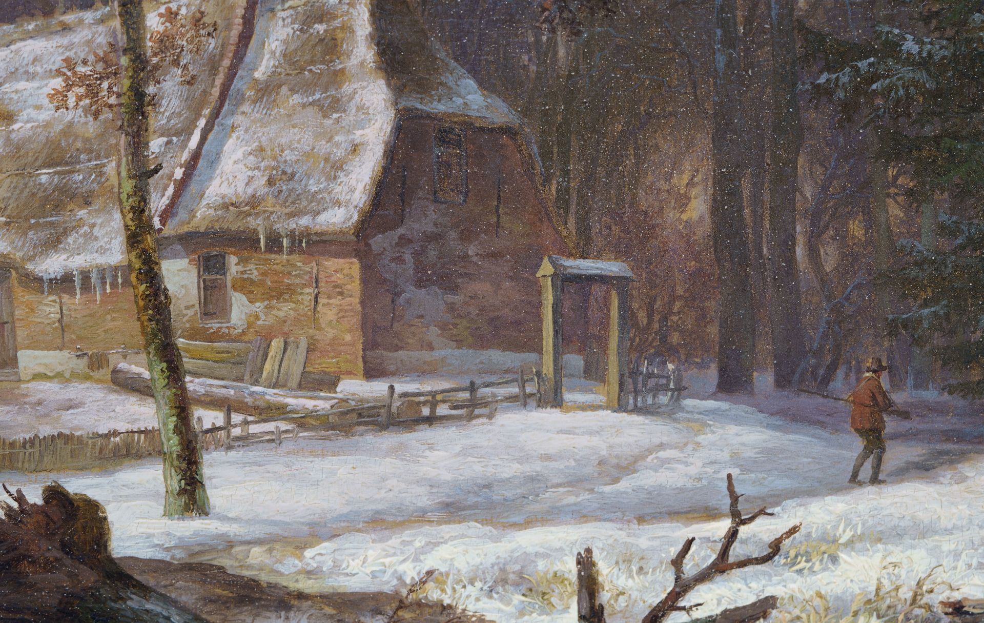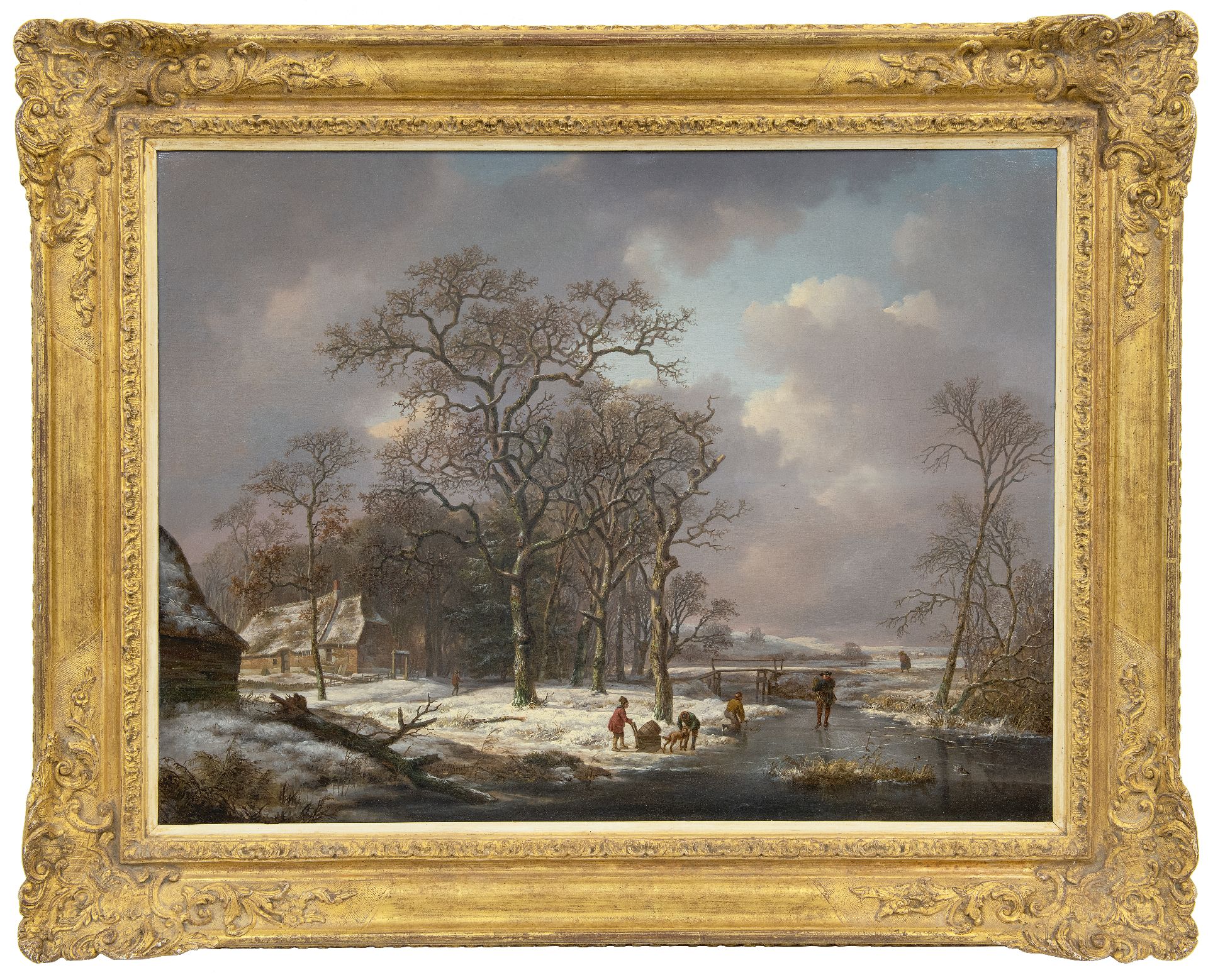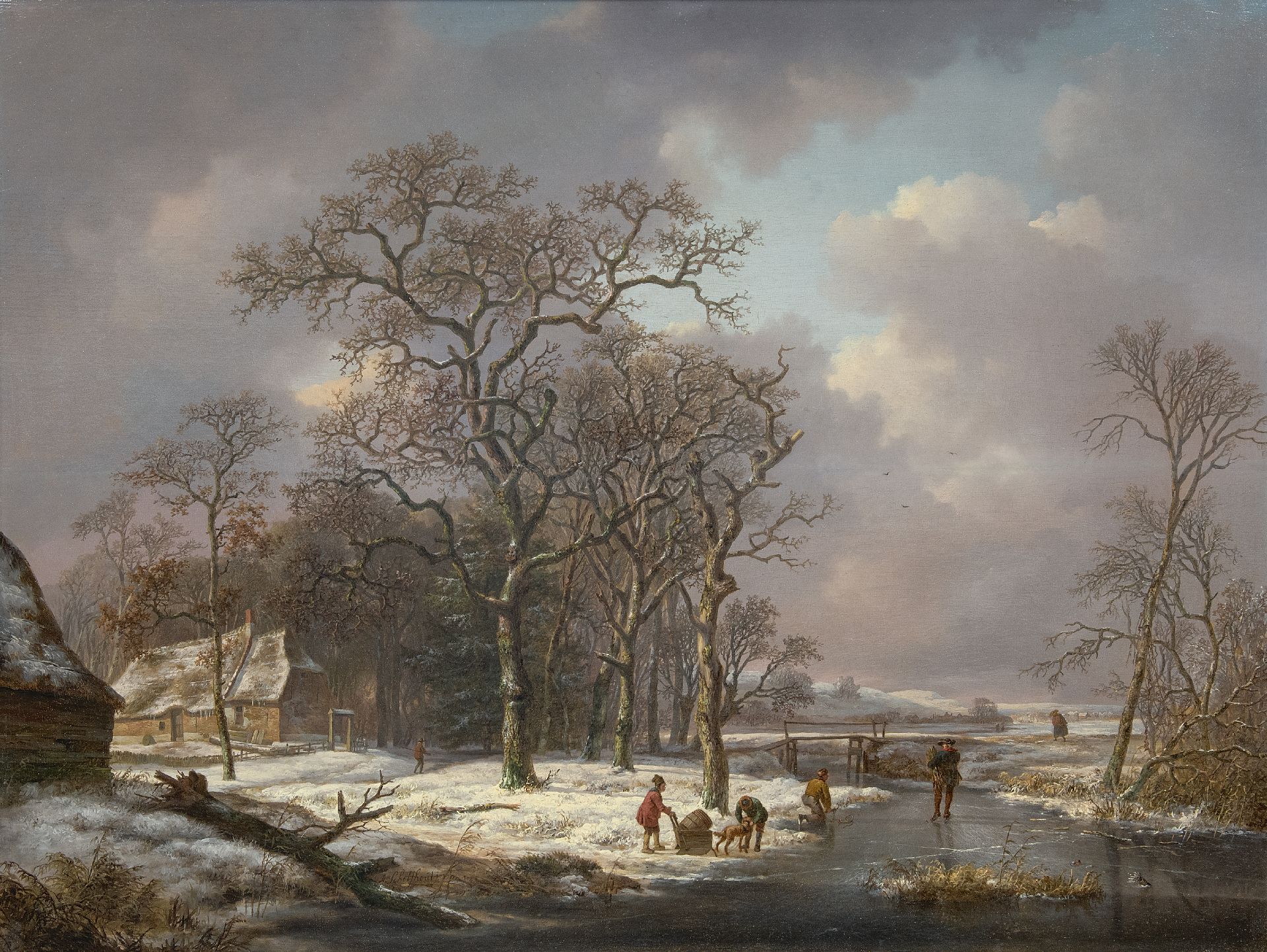 Andreas Schelfhout kunstwerk • schilderij • te koop Sneeuwlandschap met figuren op een bevroren sloot