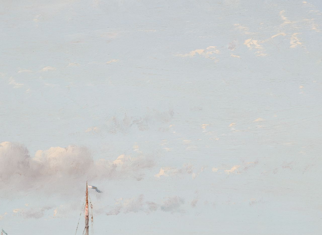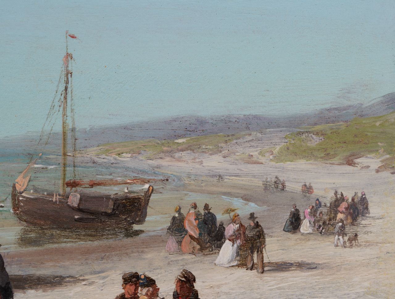 Schelfhout werkte vaak langs de Scheveningse kust en een van de eerste schilders in de 19e eeuw die zich richtte op het Hollandse strandgezicht. Hier introcuceert hij een nieuwigheidje, elegante wandelaars die zich op het strand mengen tussen de visverkopers. Rond die tijd diende zich voorzichtig het recreatieve verpozen in de buitenlucht aan. Schelfhout hield van dit soort contrasten. Het strandgezicht schilderde hij in kleine anekdotes, met groot technisch raffinement uitgewerkt.