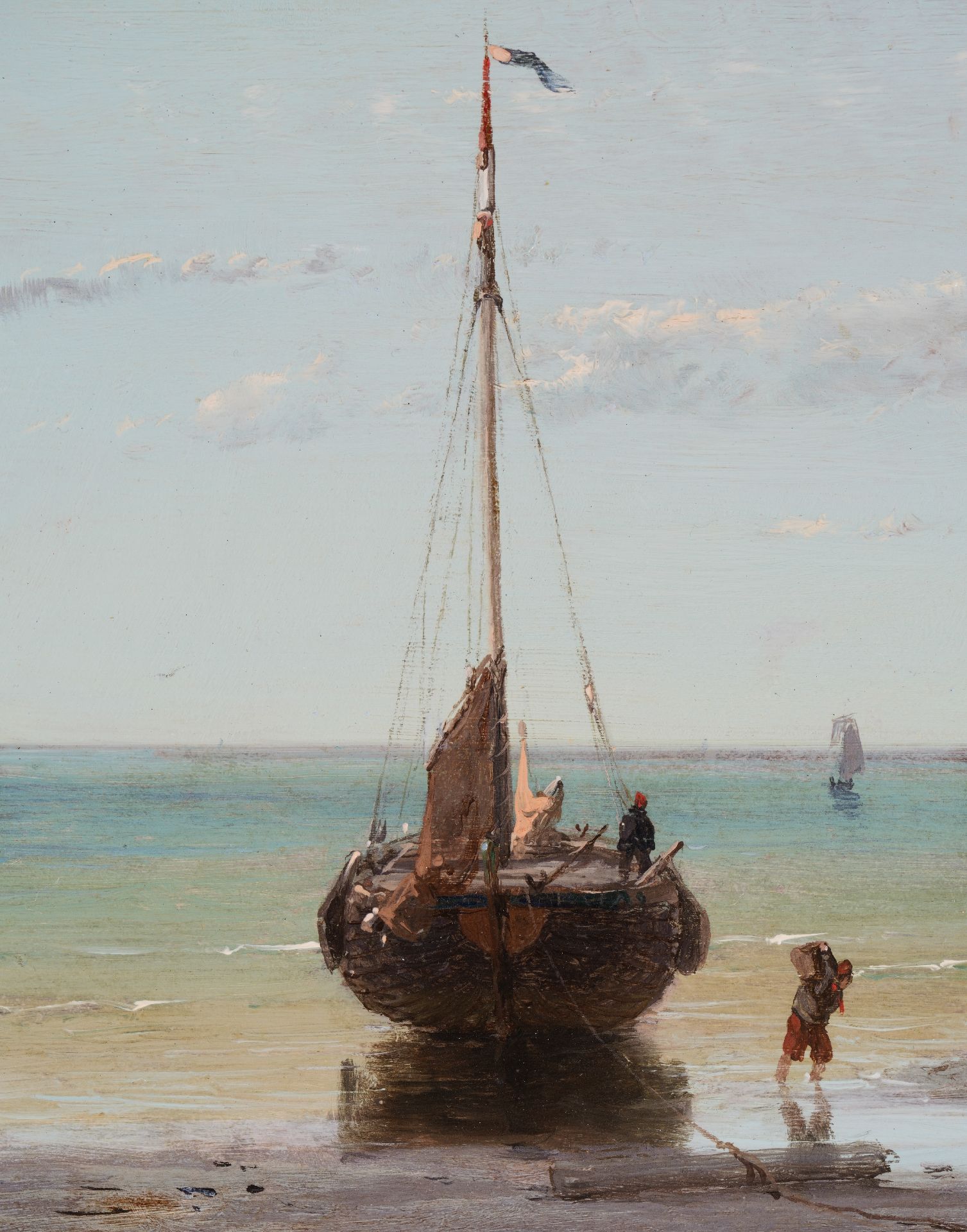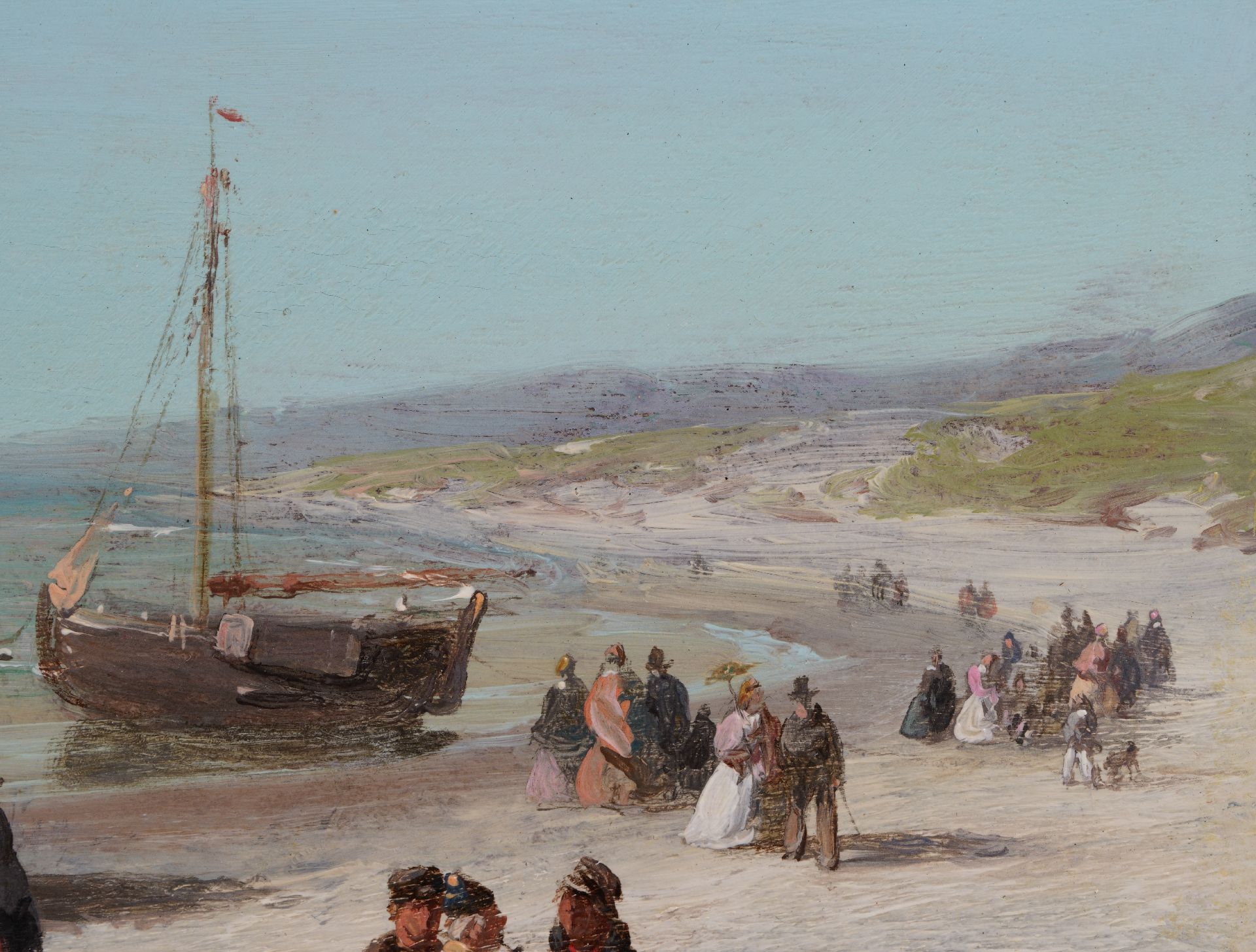 Schelfhout werkte vaak langs de Scheveningse kust en een van de eerste schilders in de 19e eeuw die zich richtte op het Hollandse strandgezicht. Hier introcuceert hij een nieuwigheidje, elegante wandelaars die zich op het strand mengen tussen de visverkopers. Rond die tijd diende zich voorzichtig het recreatieve verpozen in de buitenlucht aan. Schelfhout hield van dit soort contrasten. Het strandgezicht schilderde hij in kleine anekdotes, met groot technisch raffinement uitgewerkt.