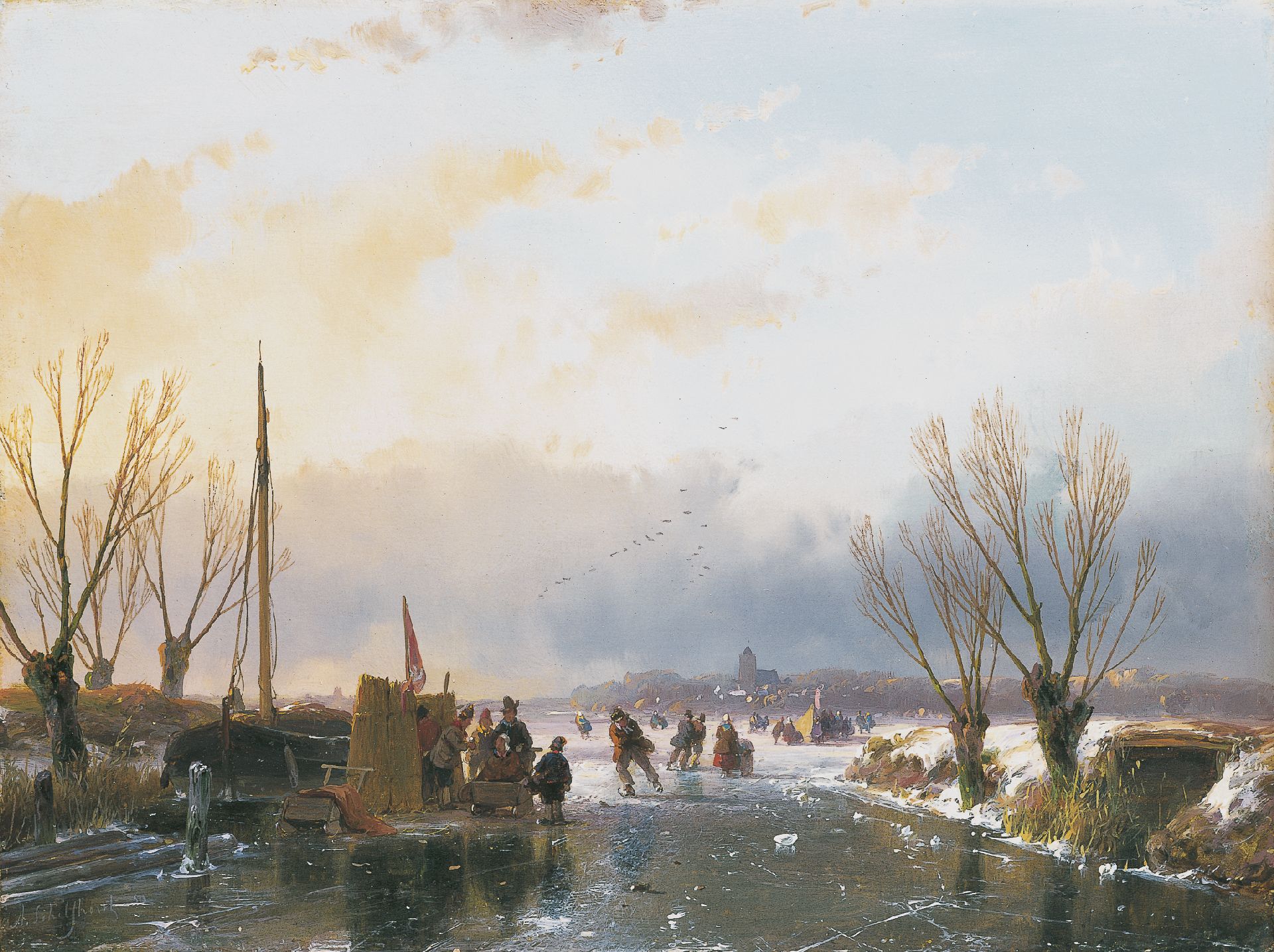 Andreas Schelfhout kunstwerk • schilderij • voorheen te koop Wintergezicht met vele schaatsers en een koek-en-zopie