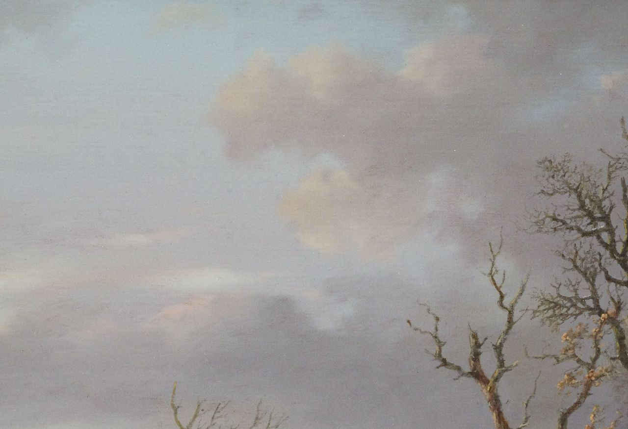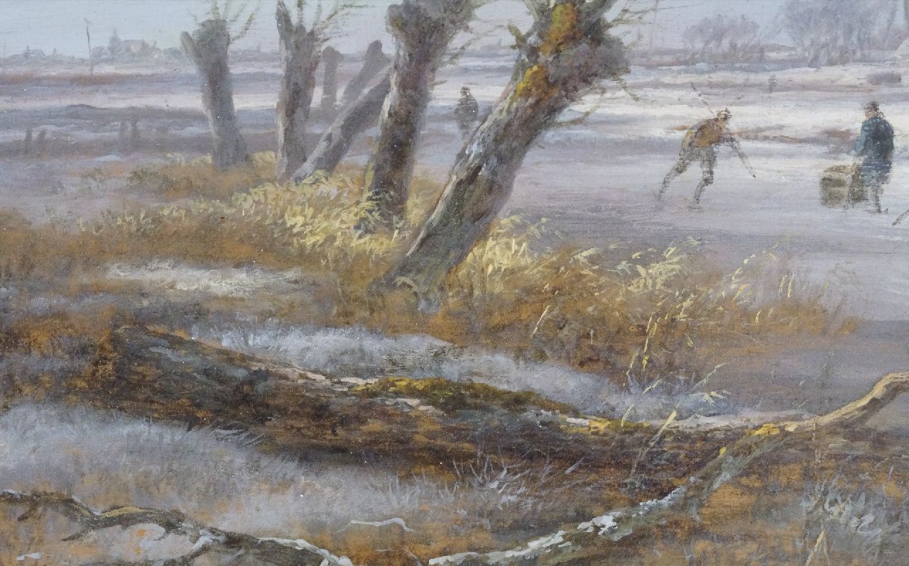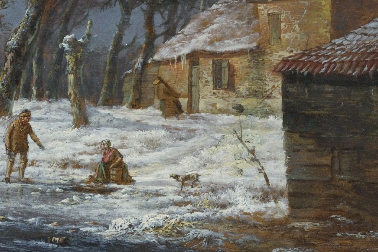Andreas Schelfhout kunstwerk • schilderij • voorheen te koop Winterlandschap met schaatsers en een wasvrouw bij een ijsgat