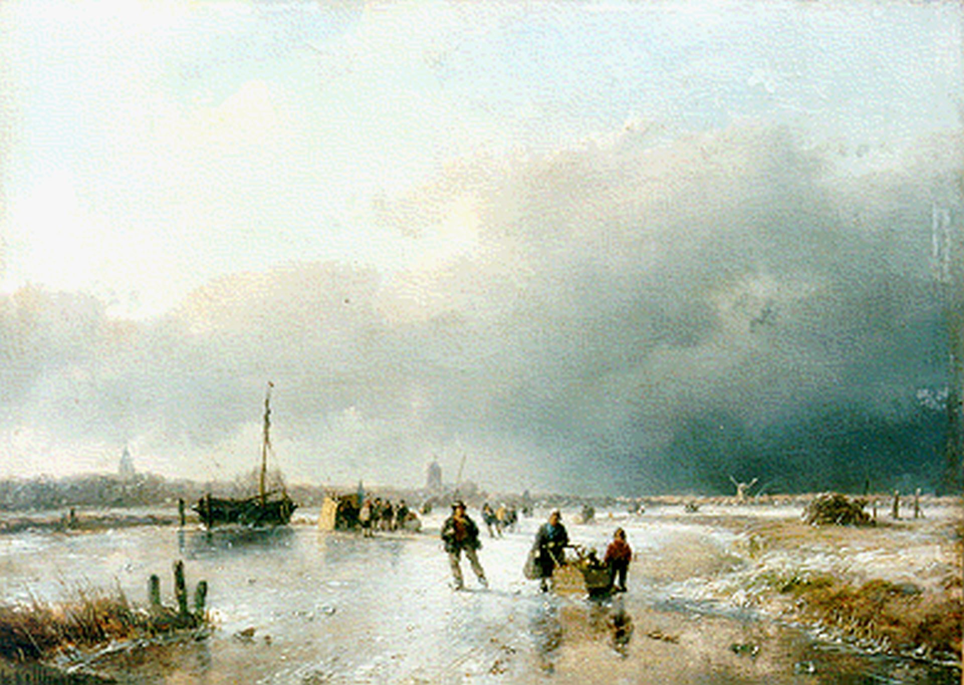 Andreas Schelfhout kunstwerk • schilderij • voorheen te koop Winterlandschap met schaatsers en koek en zopie