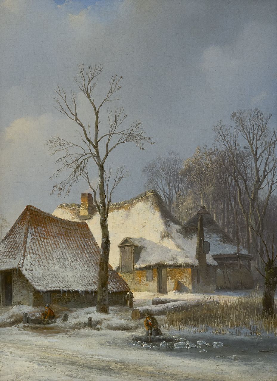 Andreas Schelfhout kunstwerk • schilderij • voorheen te koop Winterse boerderij met schaatser en ijsvisser