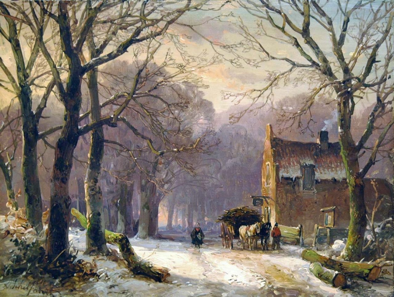Andreas Schelfhout kunstwerk • schilderij • voorheen te koop Winterse namiddag bij het tolhuisje