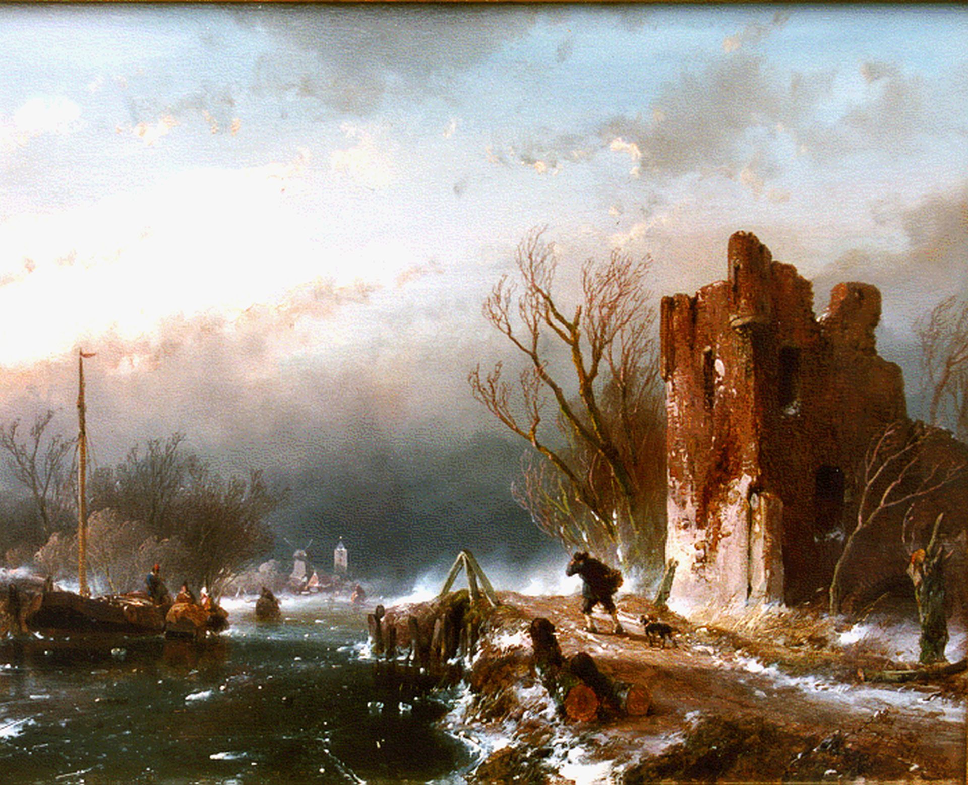Andreas Schelfhout kunstwerk • schilderij • voorheen te koop Winterse storm bij vaart met ruïne