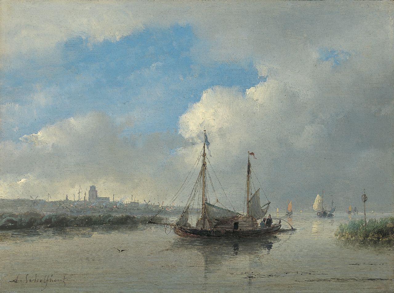 Andreas Schelfhout kunstwerk • schilderij • voorheen te koop Zeilschepen op de Merwede bij Dordrecht