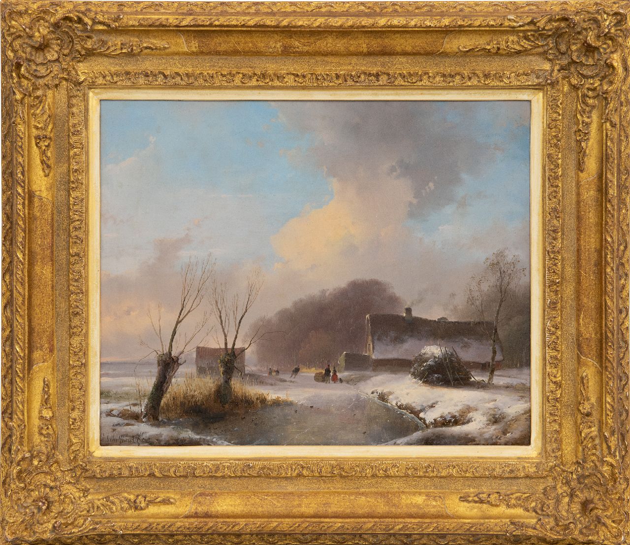 Andreas Schelfhout kunstwerk • schilderij • voorheen te koop Zonnig wintergezicht met schaatsers en boerderij