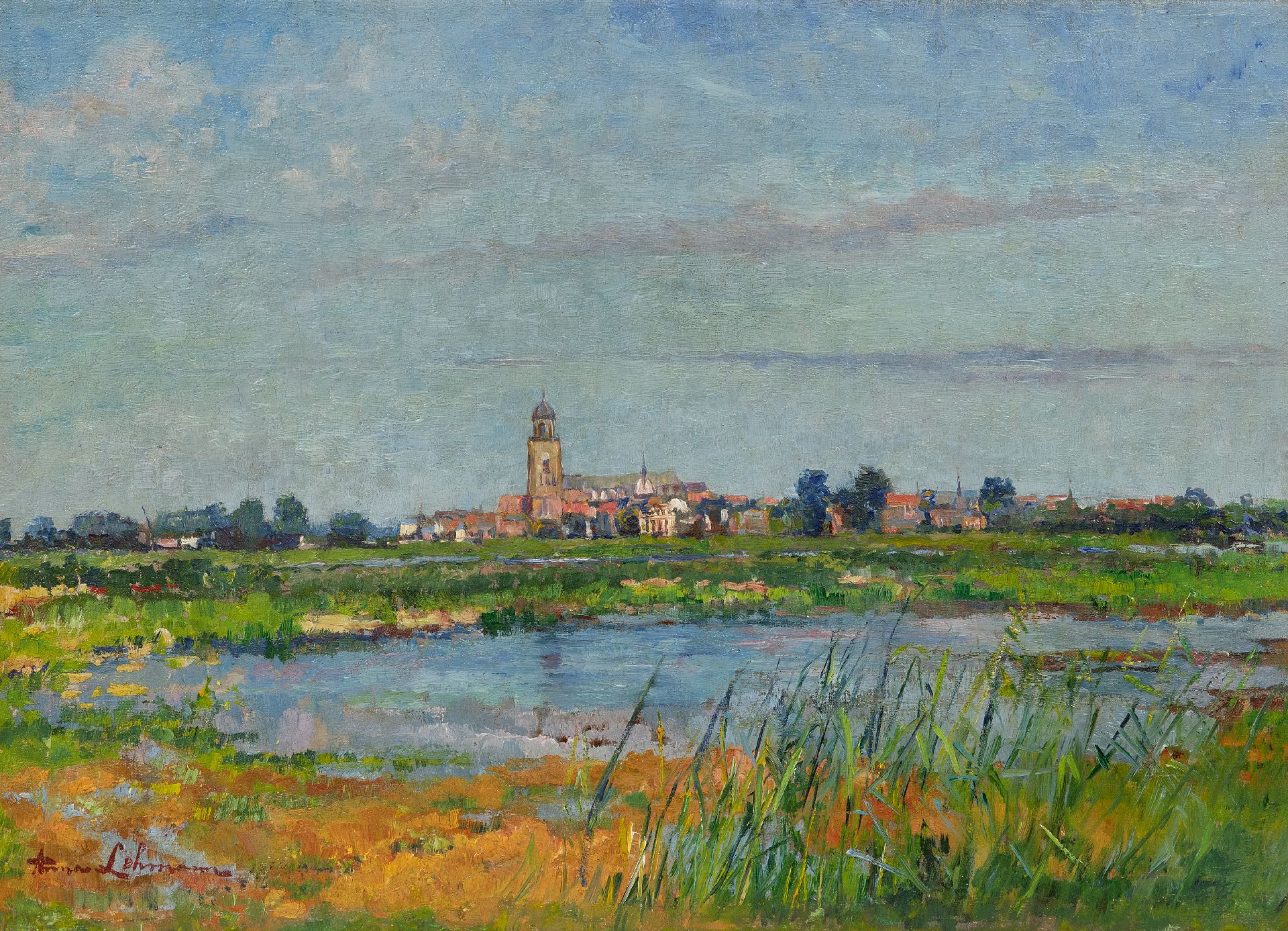 Anna Lehmann kunstwerk • schilderij • voorheen te koop Gezicht op Deventer met de Grote Kerk
