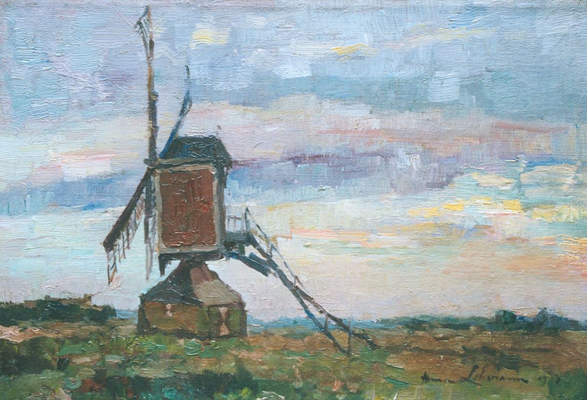 Anna Lehmann kunstwerk • schilderij • voorheen te koop Molen in een landschap bij avondschemering