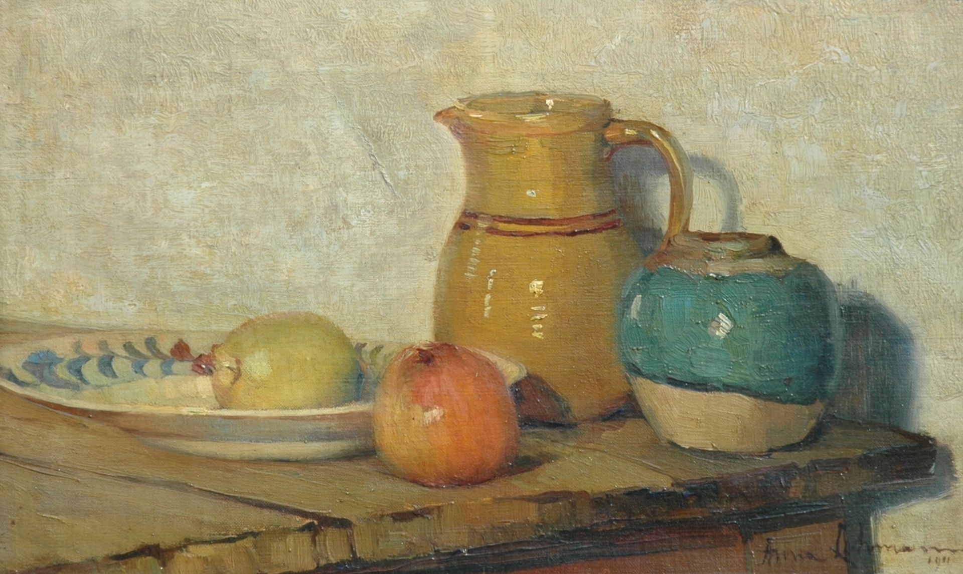 Anna Lehmann kunstwerk • schilderij • voorheen te koop Stilleven met kan en appels