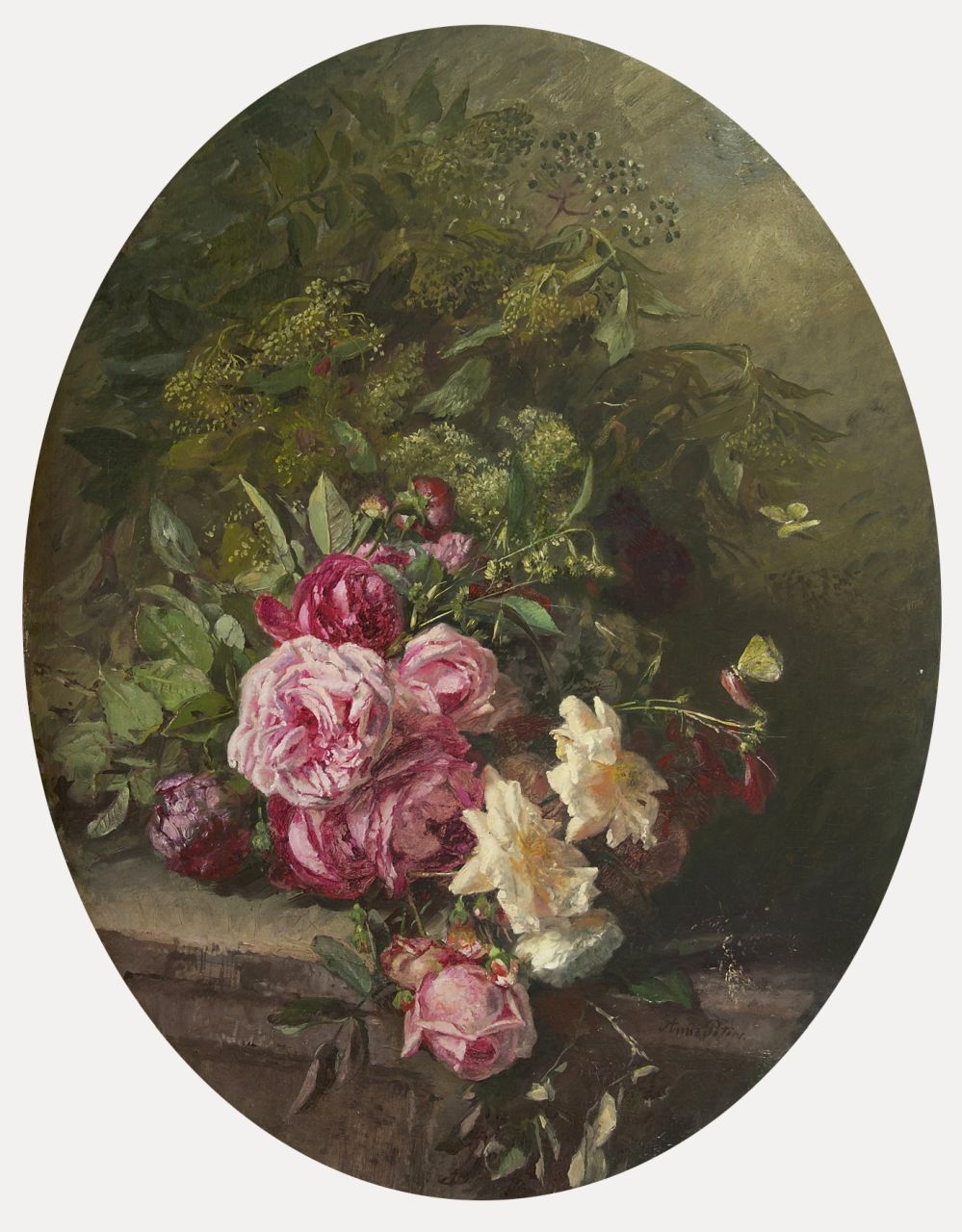 Anna Peters kunstwerk • schilderij • voorheen te koop Rozen en takken op een stenen plint