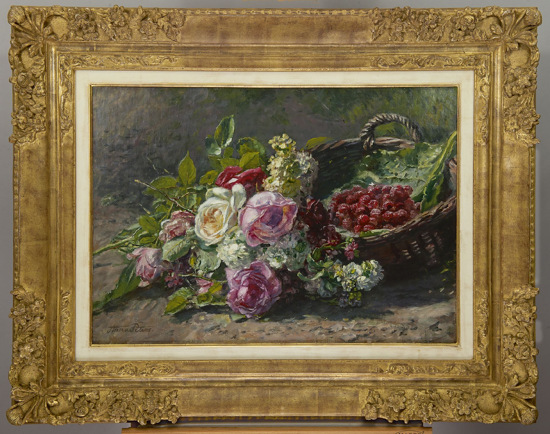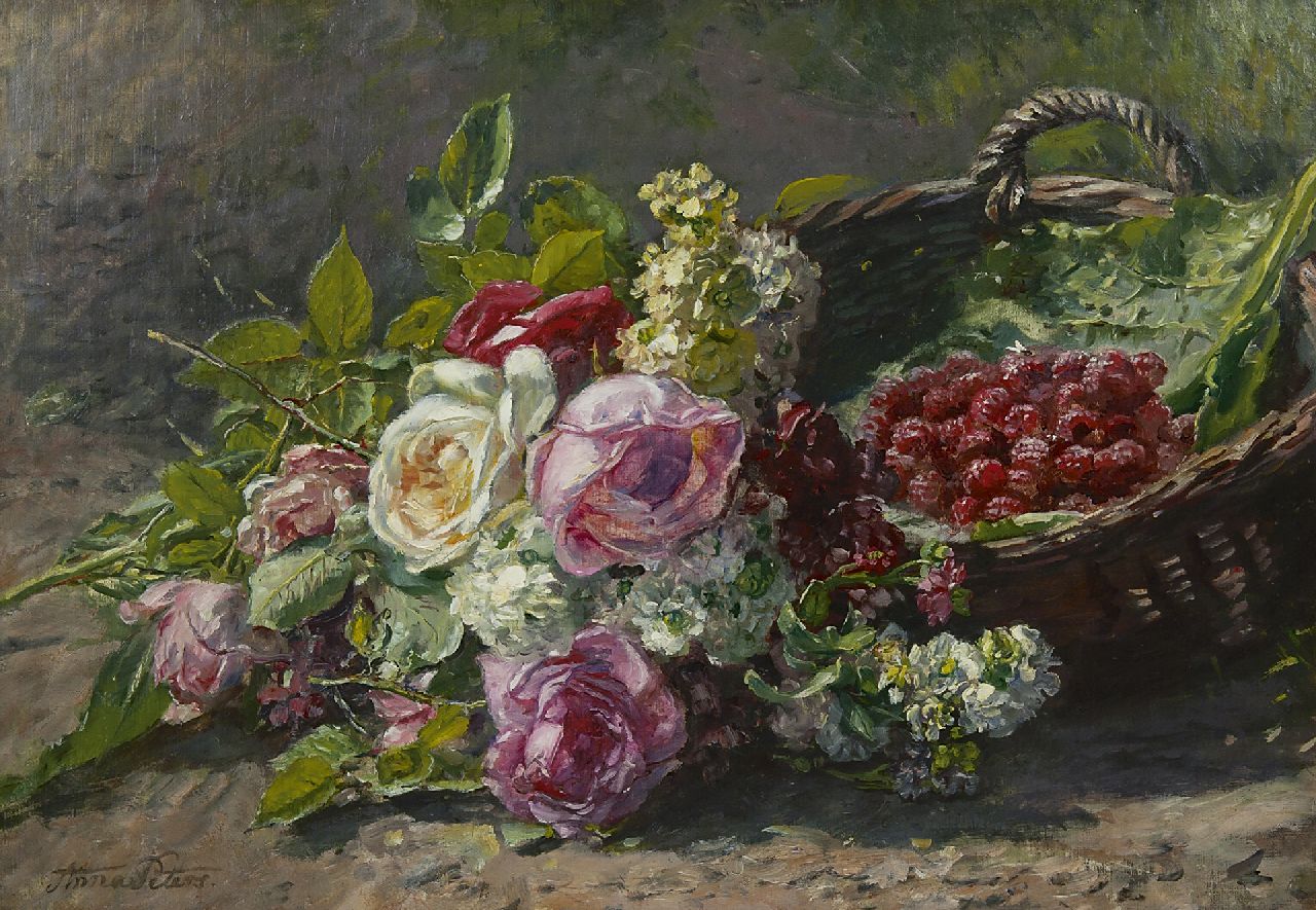 Anna Peters kunstwerk • schilderij • voorheen te koop Stilleven met rozen en korf met frambozen