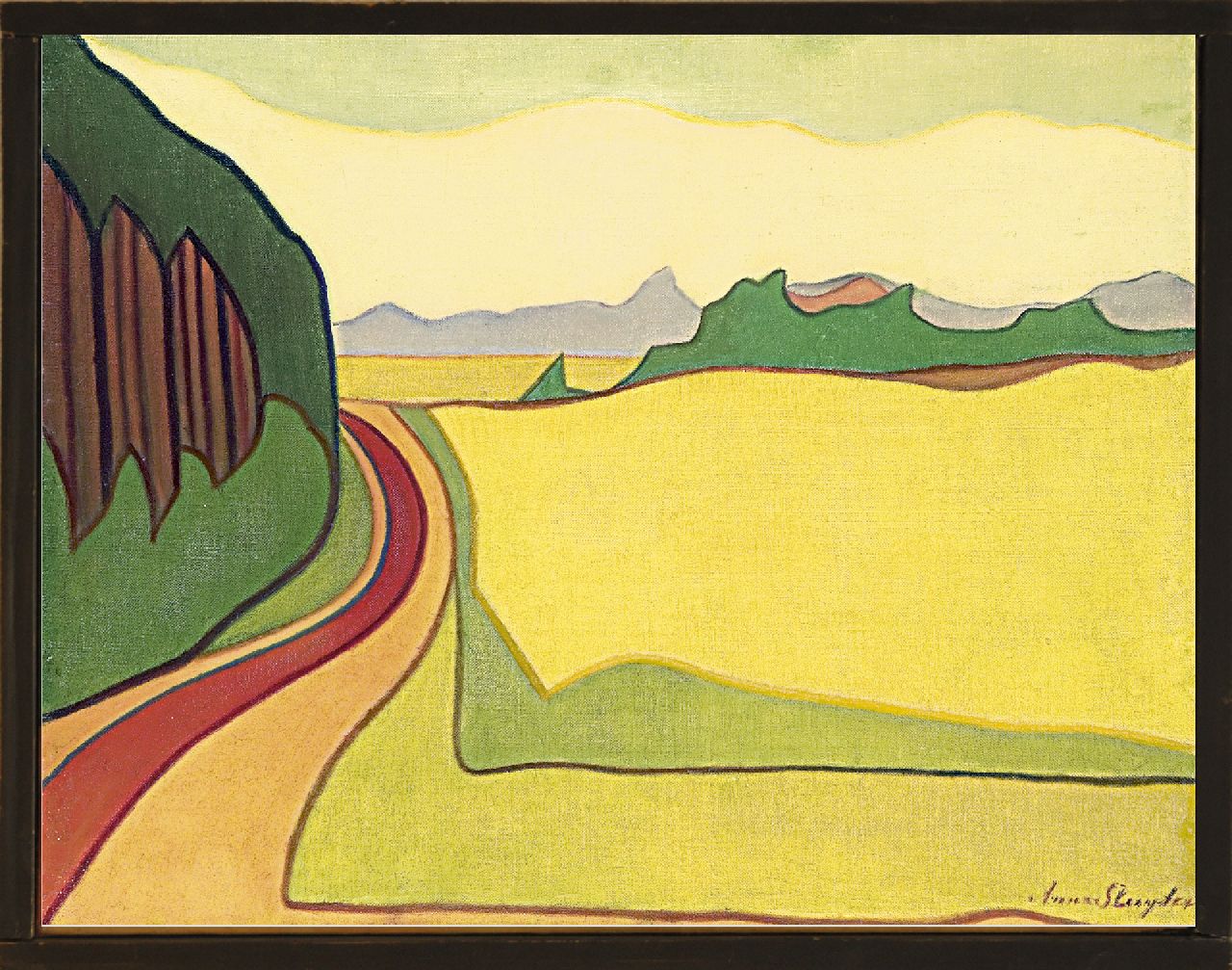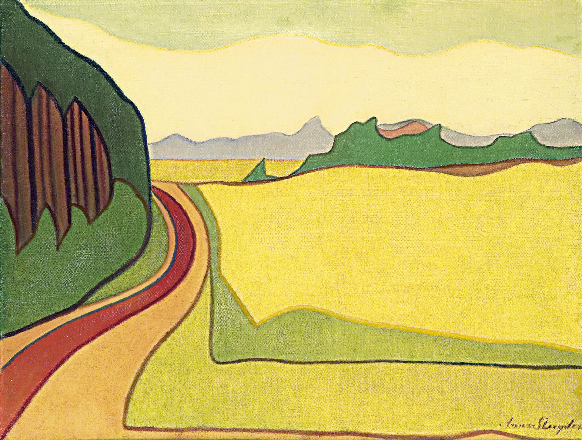 Anna Sluijter kunstwerk • schilderij • voorheen te koop Landschap met rode weg, Blaricum