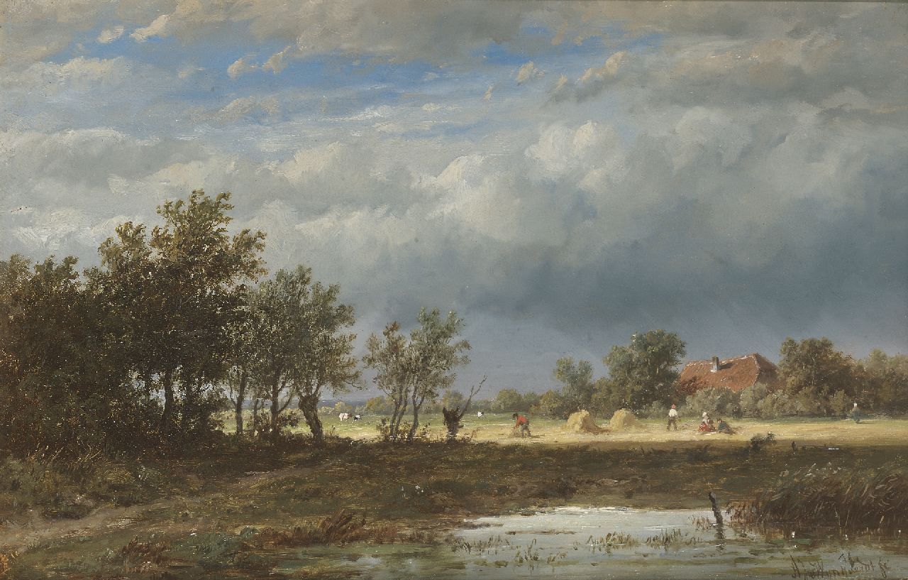 Anthonie Jacobus van Wijngaerdt kunstwerk • schilderij • voorheen te koop Hooiend landvolk bij naderende regenbui