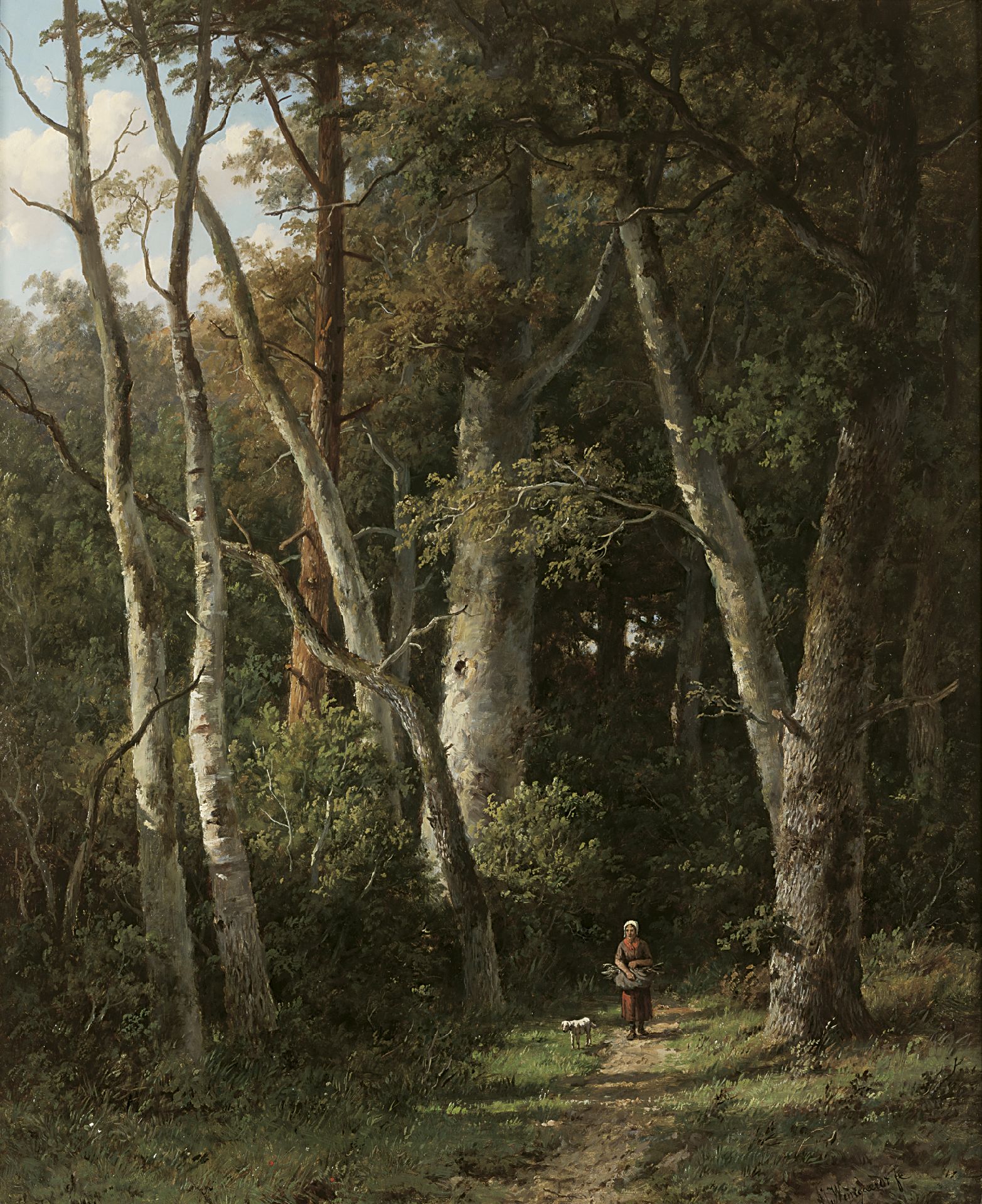 Anthonie Jacobus van Wijngaerdt kunstwerk • schilderij • voorheen te koop Houtsprokkelaarster op een bospad