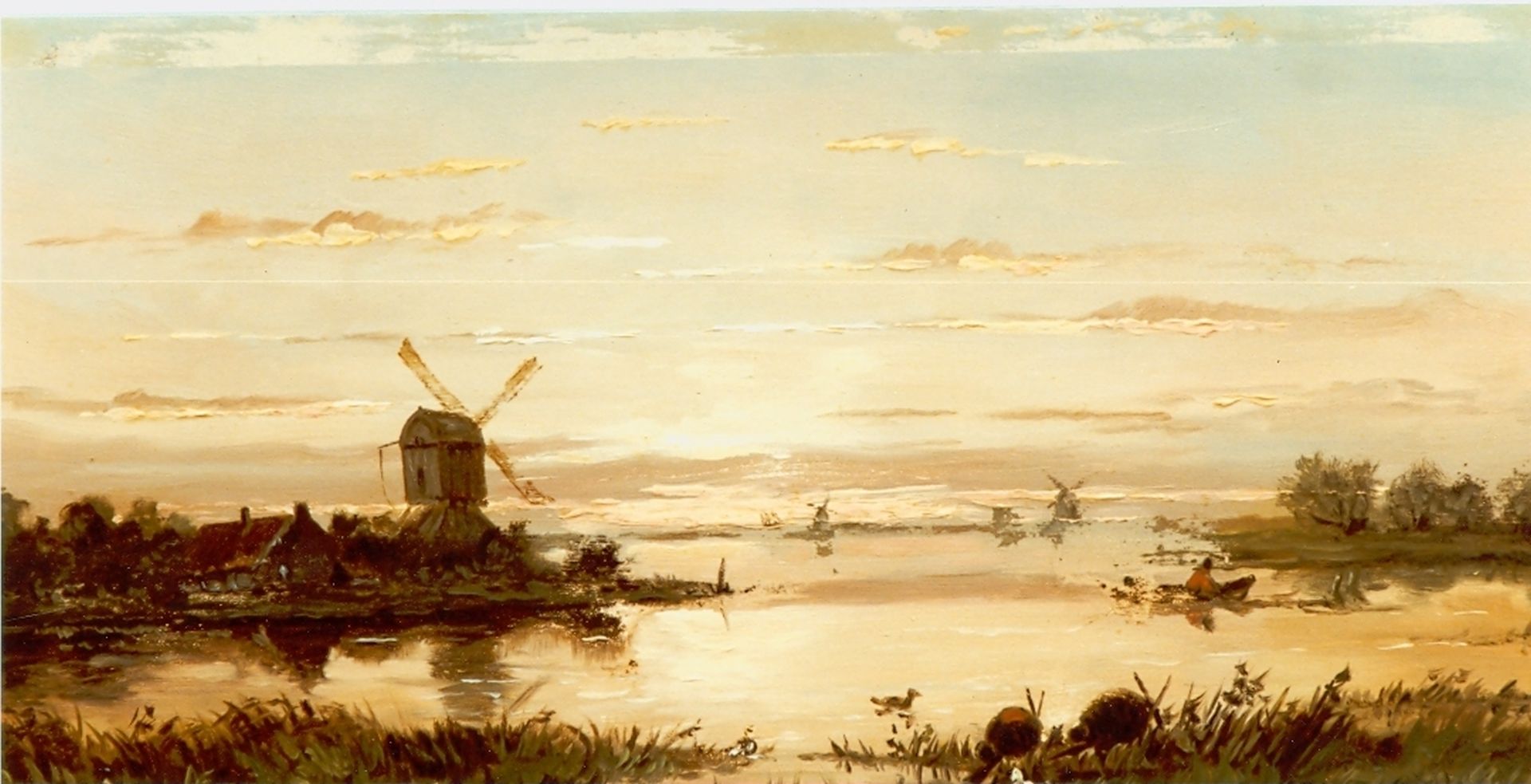 Anthonie Jacobus van Wijngaerdt kunstwerk • schilderij • voorheen te koop Plasgezicht bij avond met molens