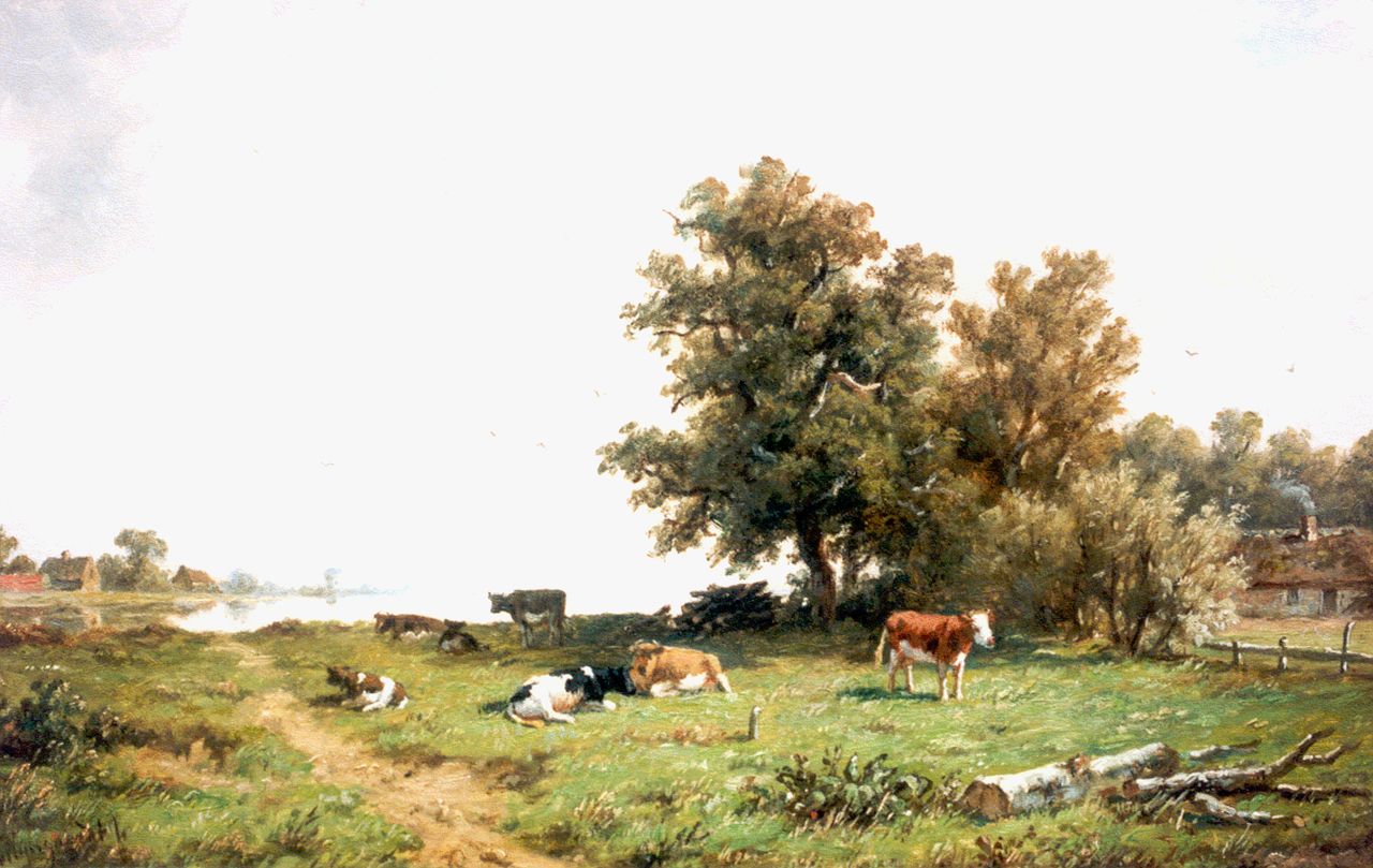 Anthonie Jacobus van Wijngaerdt kunstwerk • schilderij • voorheen te koop Rivierlandschap met koeien aan de waterkant