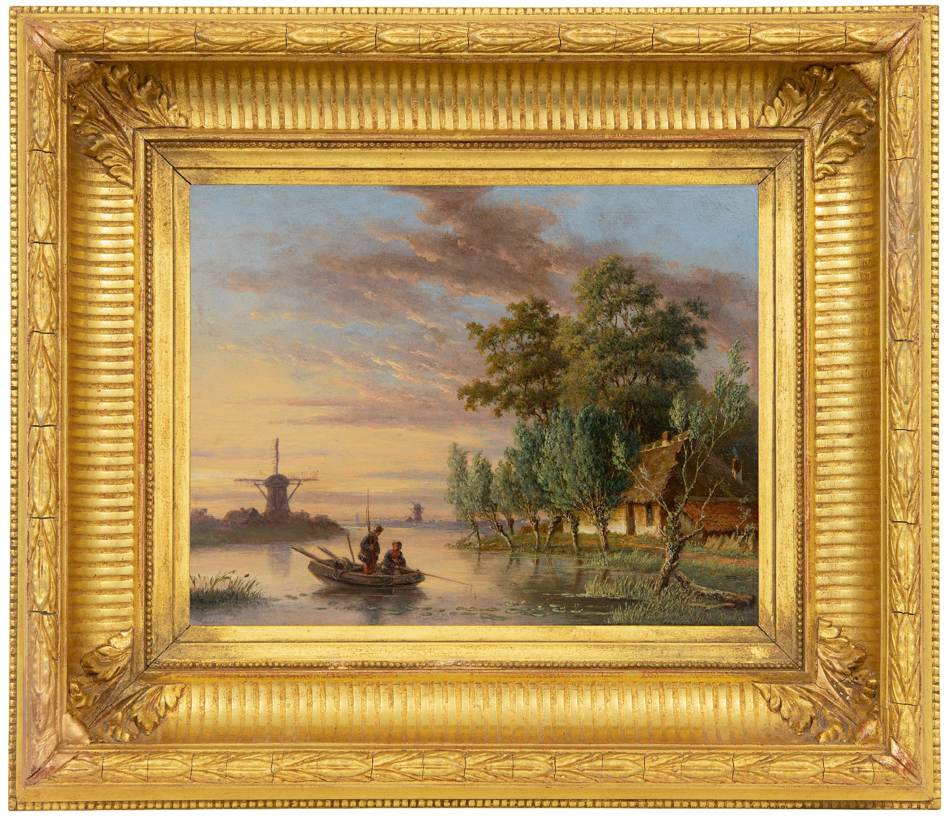 Rivierlandschap met vissers, bij zonsondergang