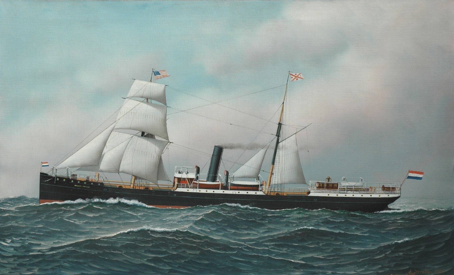 Anthony Jacobsen kunstwerk • schilderij • voorheen te koop Het stoom-zeilschip De Oranje Nassau onder zeil naar Amerika