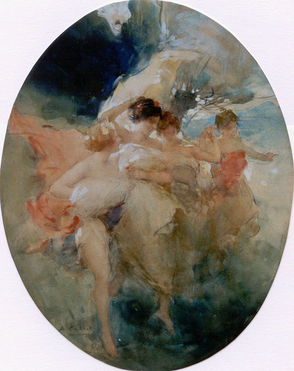 Antoine Calbet kunstwerk • aquarel • tekening • voorheen te koop Dansende bosnimfen