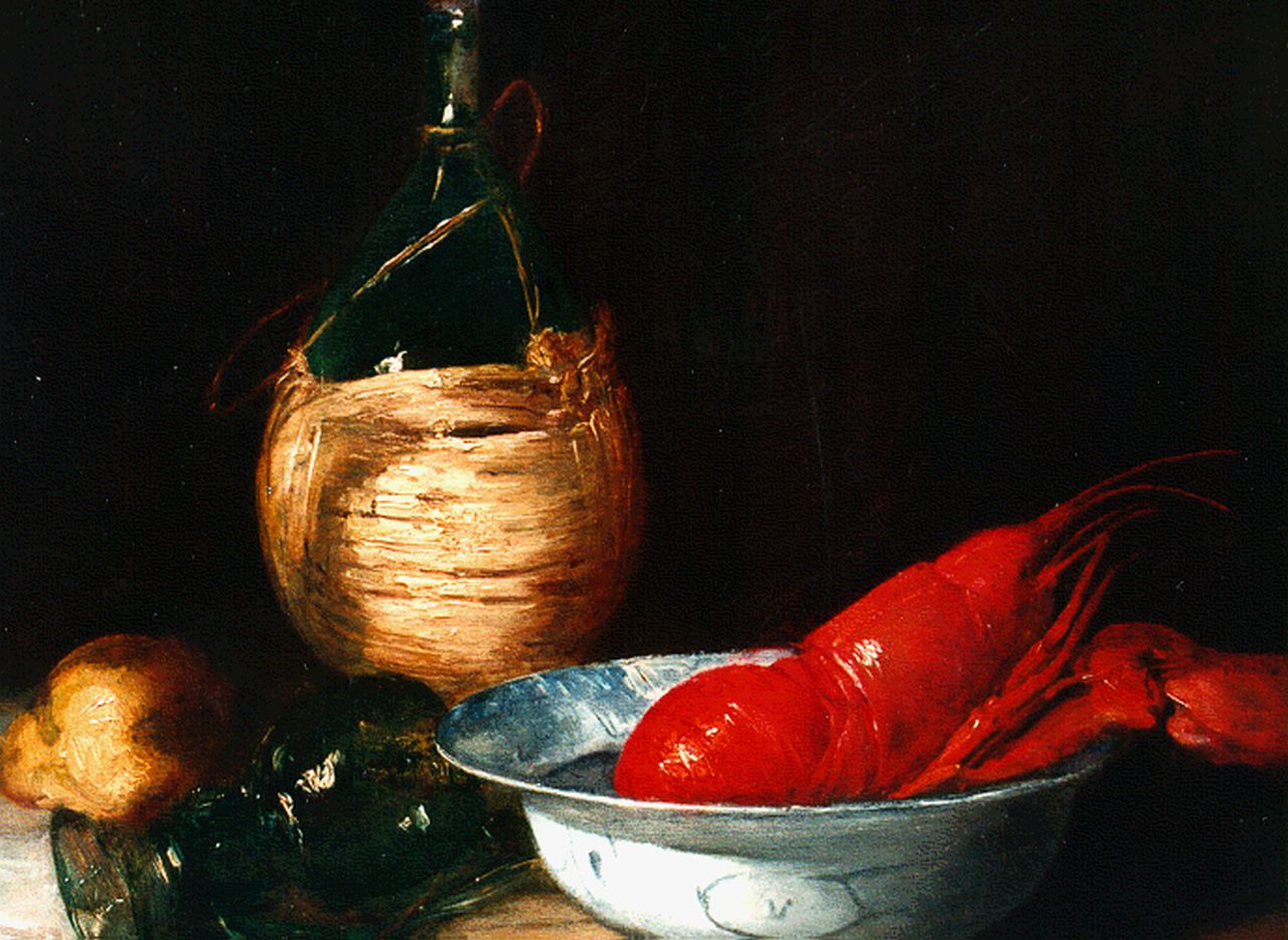 Antoine Vollon kunstwerk • schilderij • voorheen te koop Stilleven met kreeft en chiantifles