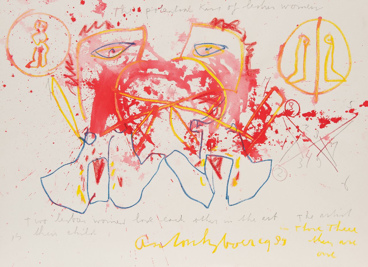 annotatie m.b.: 'the potential kiss of lesbian women', middenonder: 'two lesbian women love each other in the art the artist is their child', rechtsonder: 'in those three they are one'