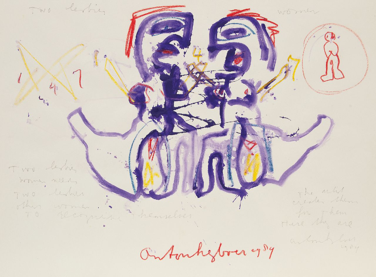 l.b.: 'two lesbian', r.b.: 'women', l.o.: 'two lesbian women needs two lesbian other women to recognize themselves', r.o.: 'the artist creates them for them here they are anton heyboer 1984'